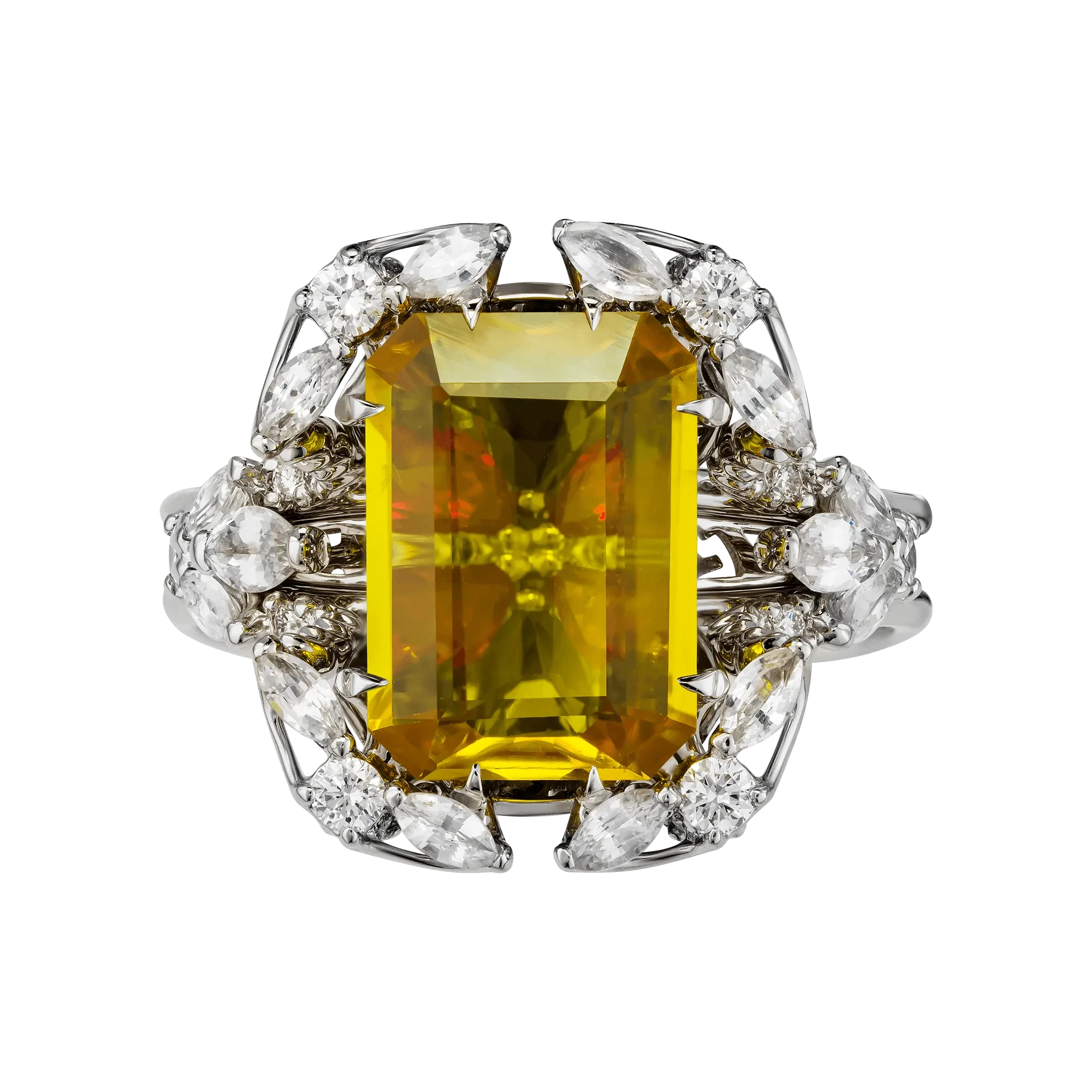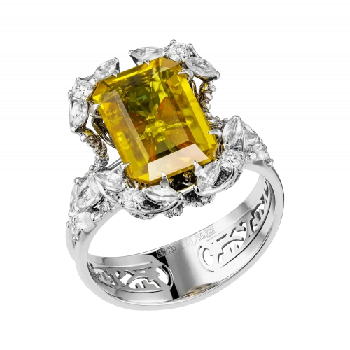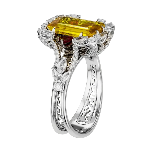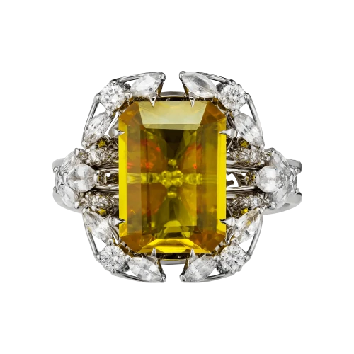 В произведении ювелирного искусства сплетаются свет и тени Востока, сказка и драгоценная реальность. Центральный акцент – солнечный сапфир из Шри-Ланки весом 3,72 карата, в глубине которого рождаются мягкие розовые отблески, словно напоминание о заре над пустыней. Его сияние становится сердцем архитектурной композиции, построенной по законам восточной роскоши.