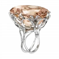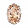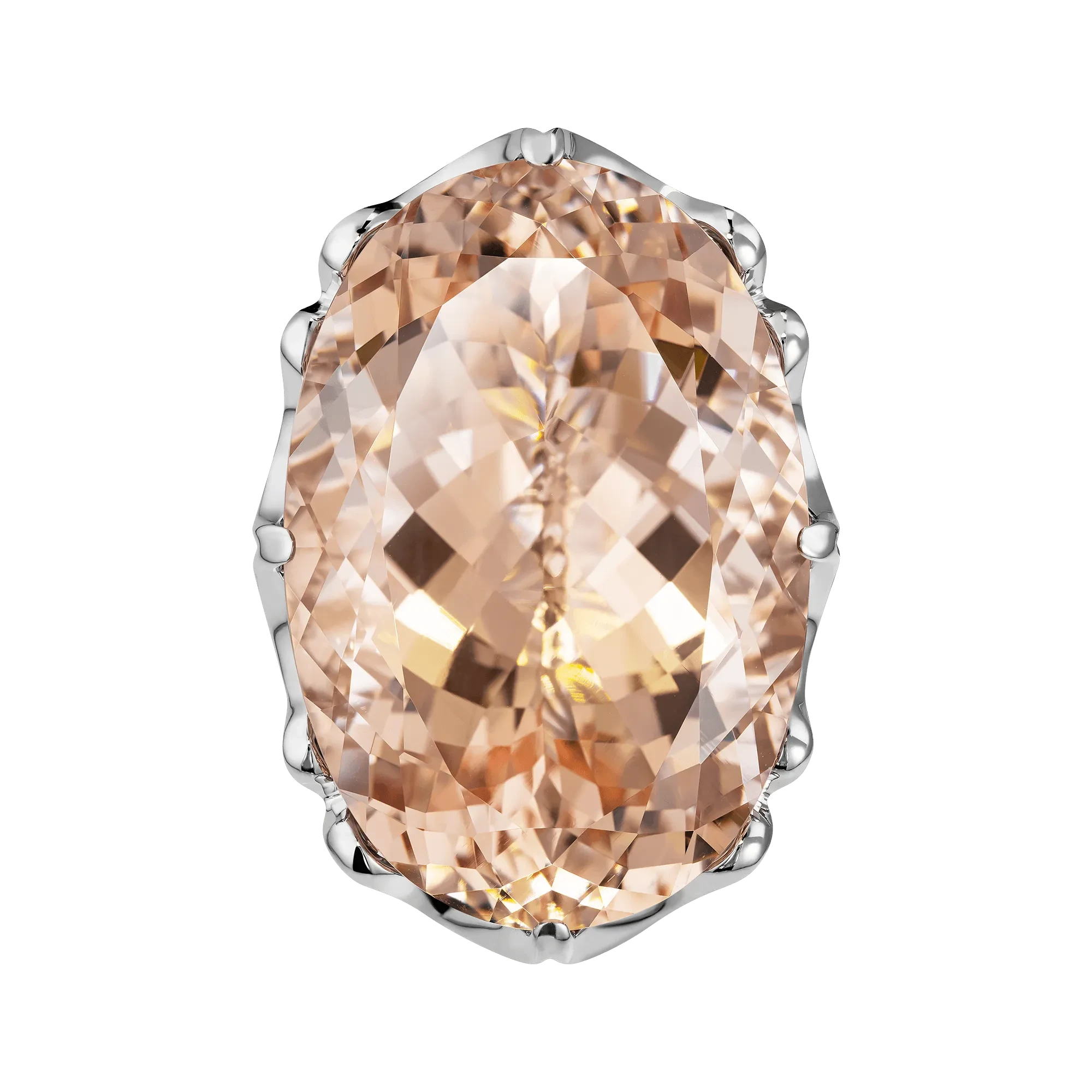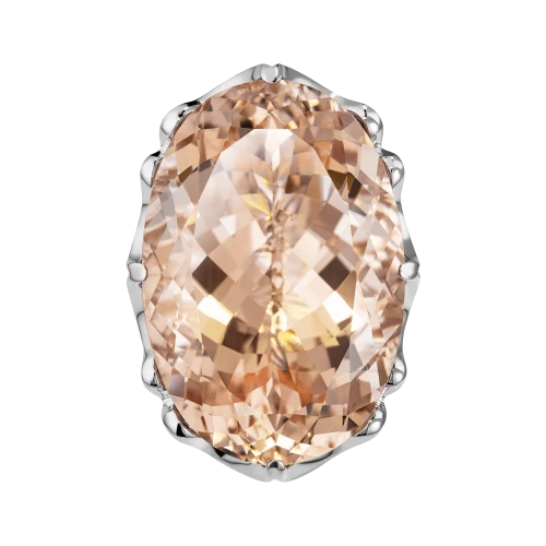 В центре композиции – морганит весом 67,02 карата, редкий природный минерал исключительной чистоты и утончённого сияния. Его мягкий оттенок переливается на грани персикового и розового, словно он вобрал тепло солнца и прозрачность рассветного неба. Подобные экземпляры встречаются в природе единично: каждый уникален по цвету и прозрачности.
