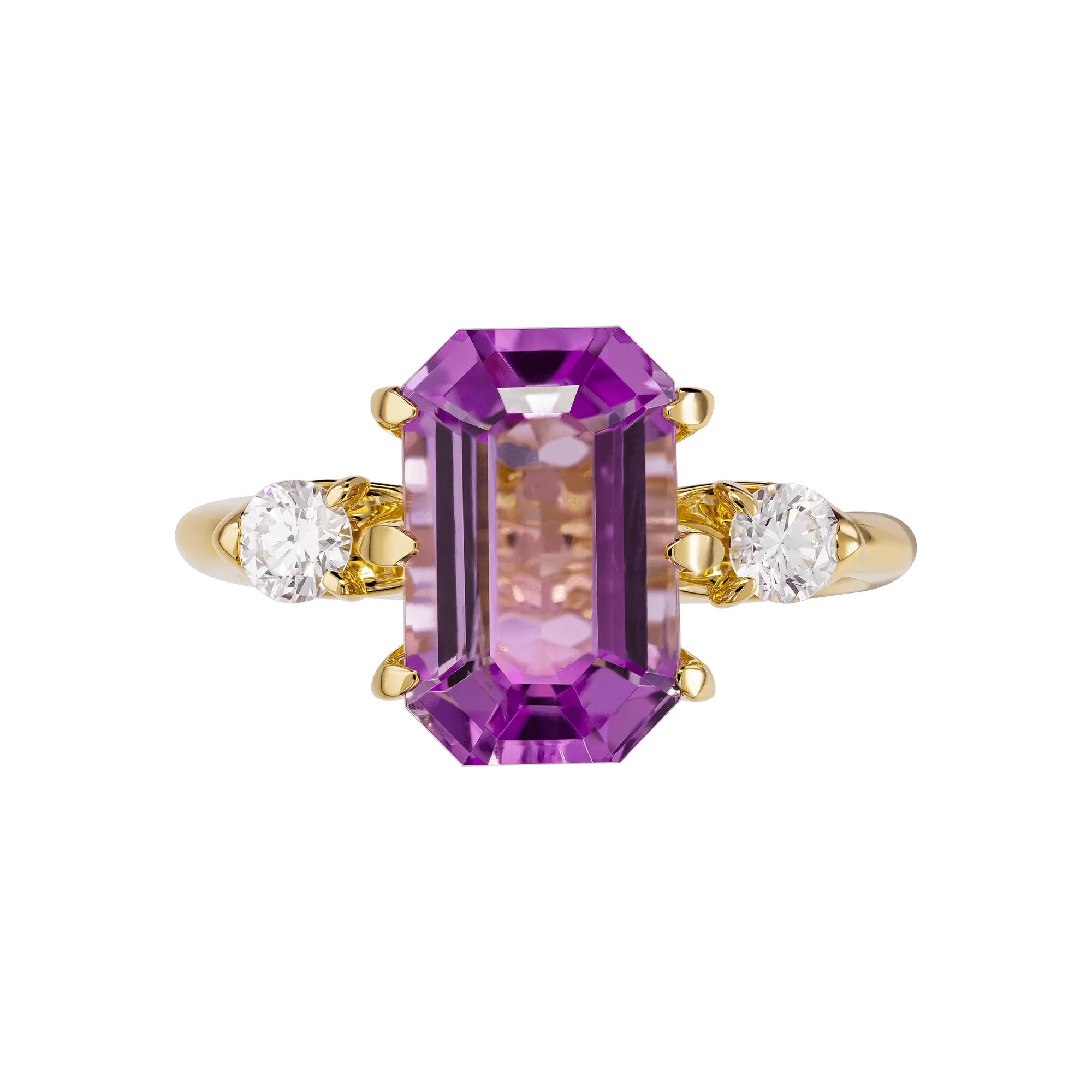 В центре сияет бразильский кунцит весом 4,96 карата – природный камень, поражающий своим сиренево-розовым свечением. Его прозрачные грани улавливают свет и рождают тонкую игру оттенков, напоминающую трепетные строки поэзии. Два бриллианта по бокам становятся акцентами в этой гармоничной композиции, подчёркивая красоту основного самоцвета и создавая образ завершённости.