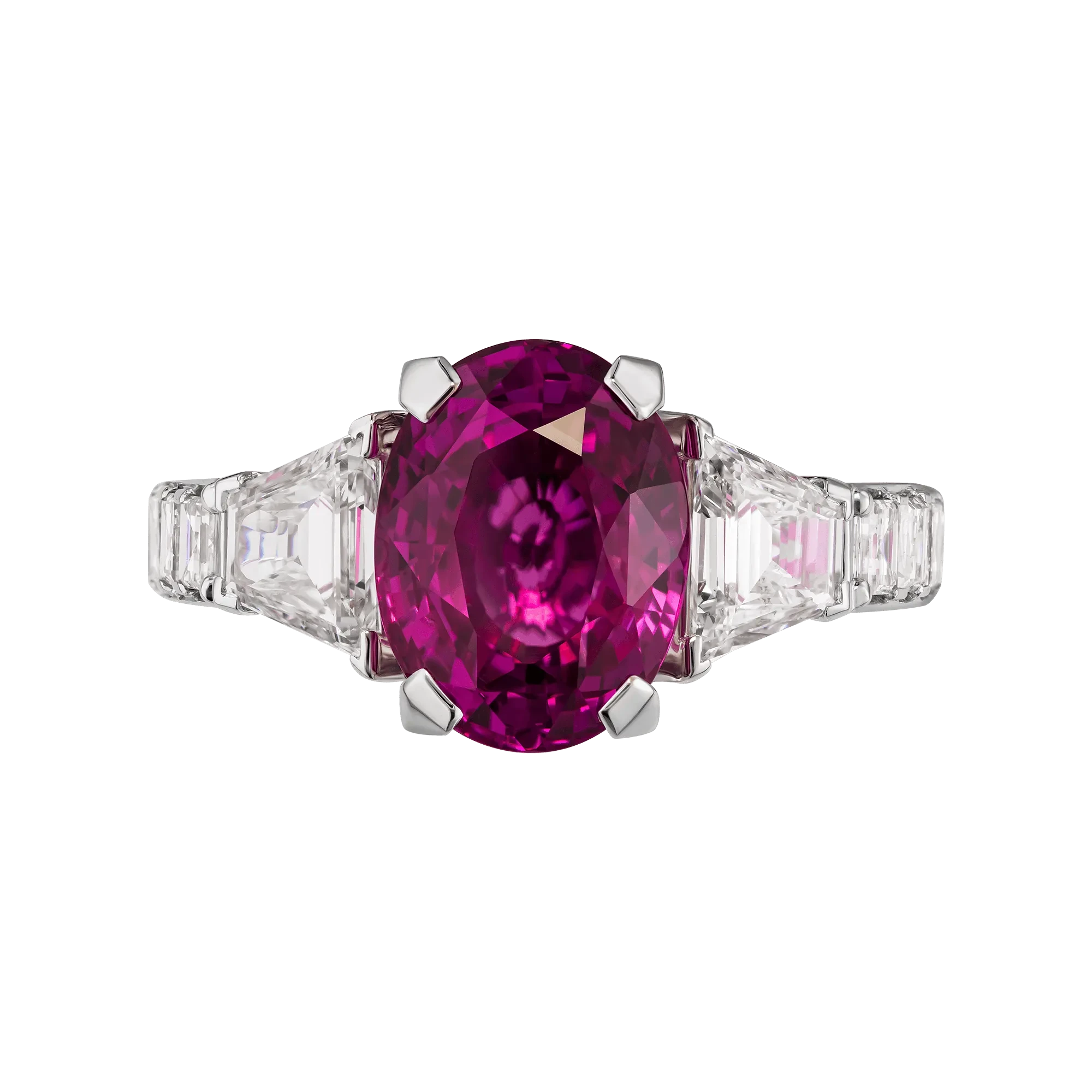 В центре композиции – мадагаскарский рубин овальной формы весом 5,12 карата, чьё сияние колеблется между алым и пурпурным, рождая ту самую порфирную глубину, в которой цвет перестаёт быть просто оттенком и становится энергией. Его тон относится к категории редчайших – насыщенный, тёплый, с холодным внутренним отблеском, характерным только для камней высшего класса.