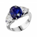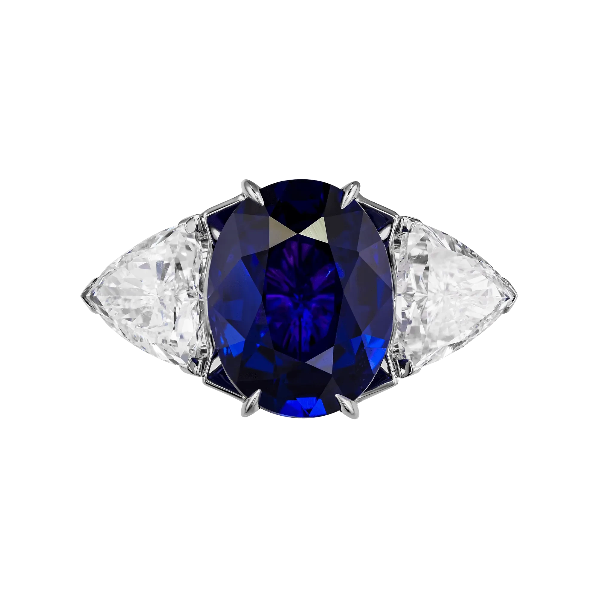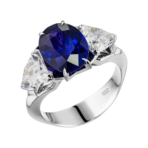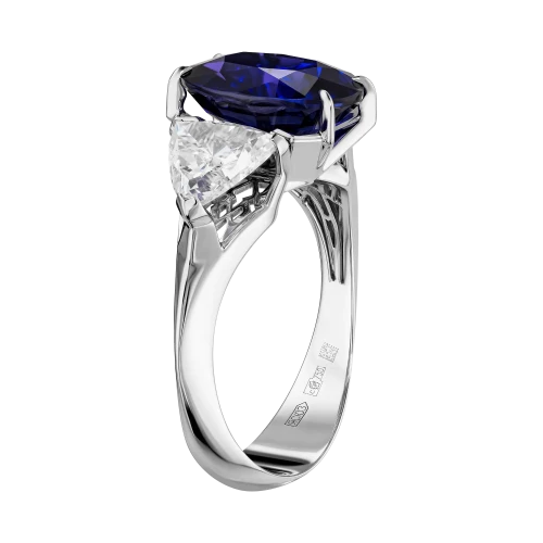 По бокам центрального камня расположены два крупных бриллианта необычной огранки – они создают архитектурную выразительность, подчёркивают чистоту цвета сапфира и усиливают его визуальную значимость. Лаконичная оправа из белого золота формирует классическую инвестиционную композицию: никаких лишних деталей, только точные линии, чистый свет и уверенность в ценности.