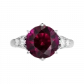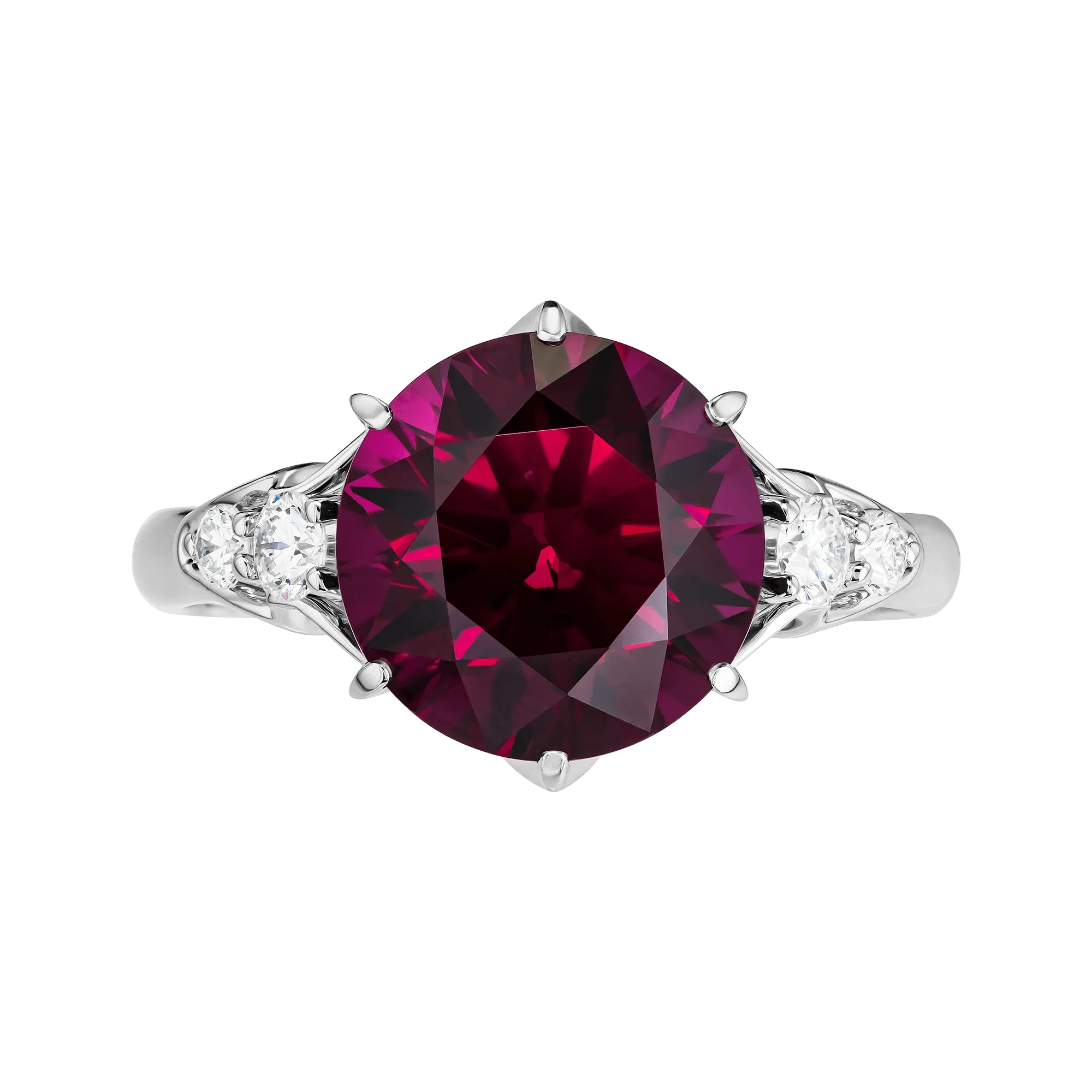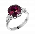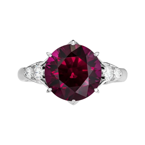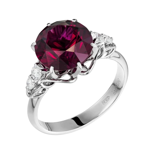 Оправа из белого золота решена лаконично и подчёркнуто сдержанно, чтобы не отвлекать от центрального акцента. Бриллианты по сторонам формируют световой ритм, усиливая контраст и деликатно поддерживая малиновую «партию» родолита.