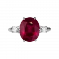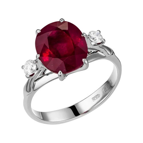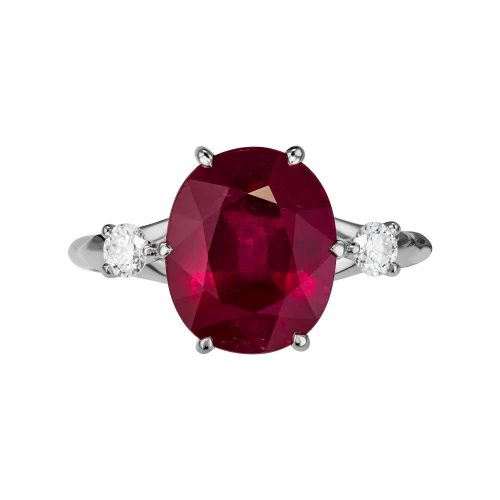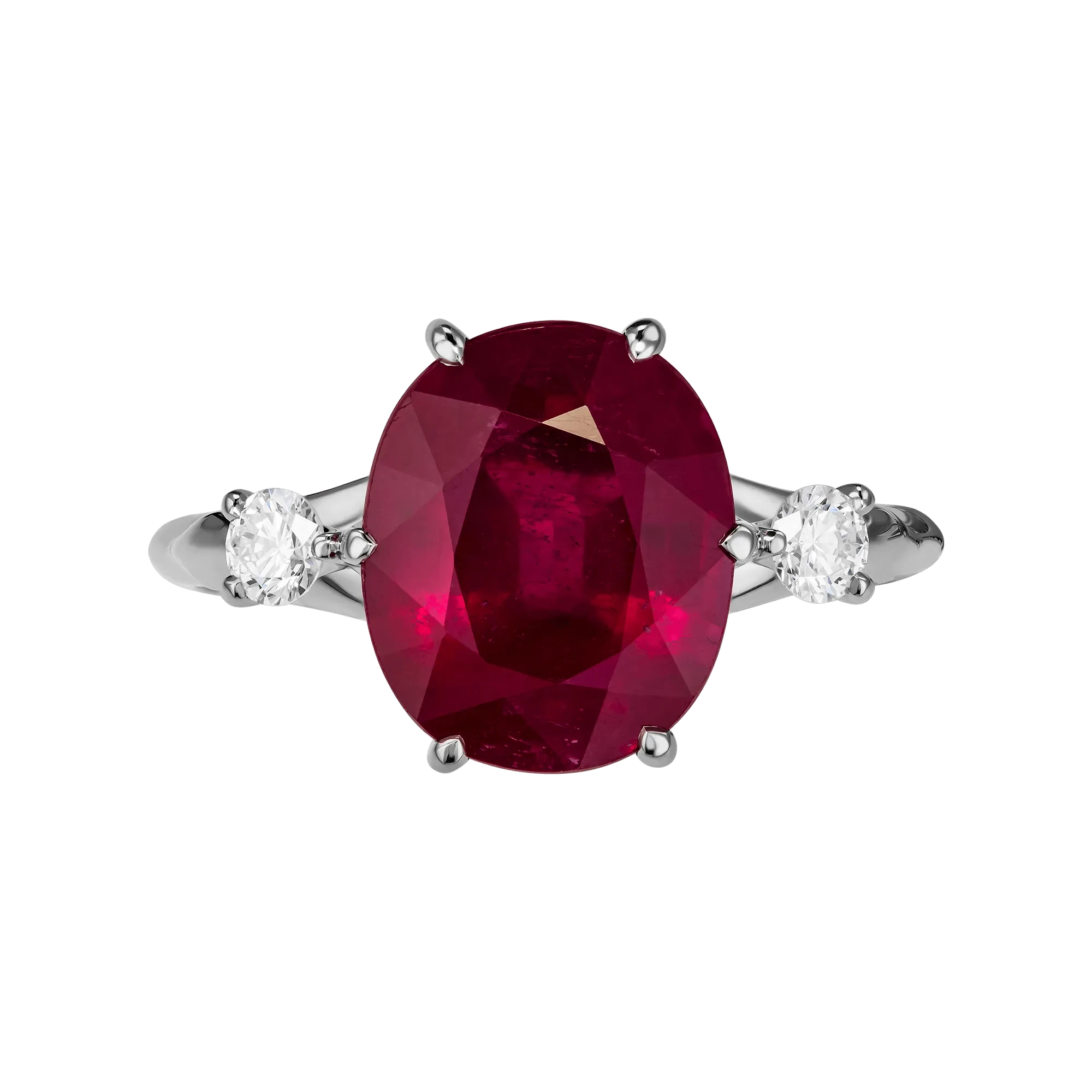 Его насыщенный цвет напоминает языки пламени, что озаряют темноту, придавая смелость и уверенность. В обрамлении бликов бриллиантов рубин звучит ещё ярче, а платиновая оправа становится сдержанным фоном, позволяющим центральному камню говорить громко и выразительно.