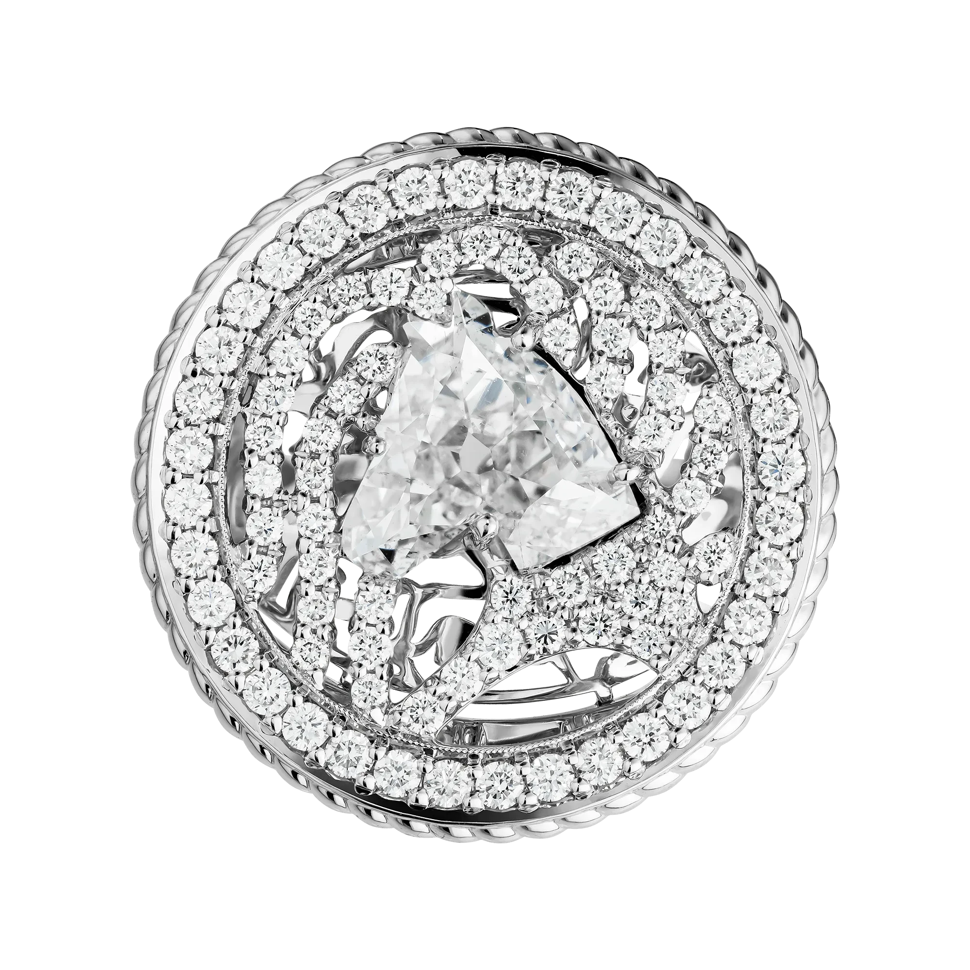 Площадка кольца выложена россыпью бриллиантов, формирующих плотное, равномерное сияние и усиливающих выразительность центрального камня. Монохромное решение — сочетание белого золота и бриллиантов — придаёт украшению графичность и сдержанную силу, лишённую избыточных акцентов.