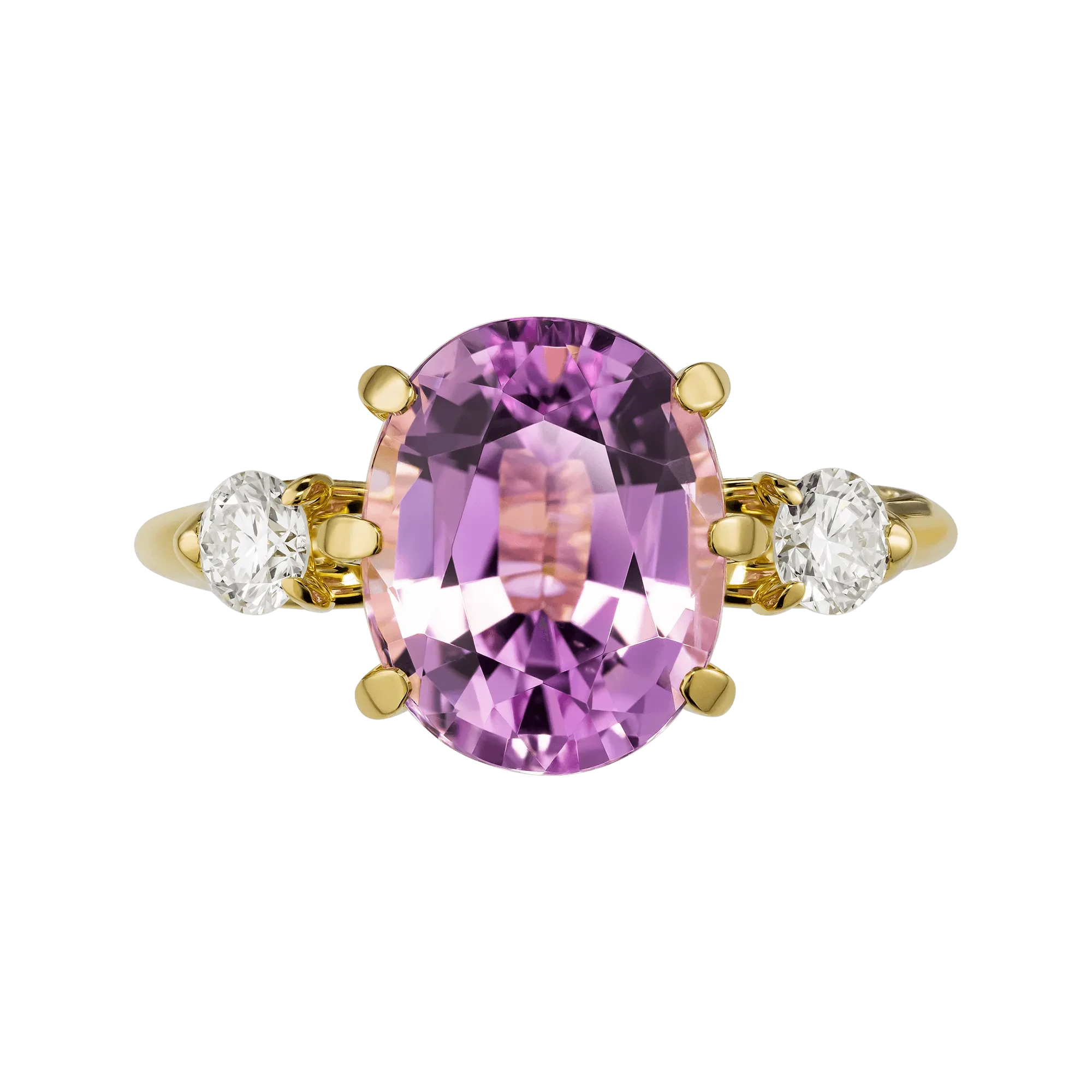 Два бриллианта по бокам поддерживают кунцит, как паузы между словами, в которых скрыто главное. Оправа из жёлтого золота объединяет композицию в цельный, спокойный жест — без излишеств и напряжения.