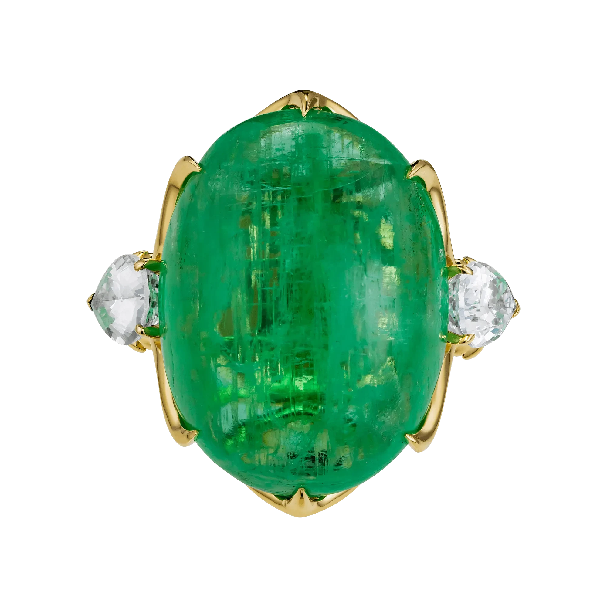 В центре композиции сияет уральский изумруд весом 12,61 карата, добытый на Малышевском месторождении – сердце Урала, где рождение каждого драгоценного камня подобно чуду. Его нежный зелёный оттенок напоминает первые ростки, пробивающиеся сквозь лёд, а мягкая полупрозрачность словно хранит в себе тепло солнца, отражённое в талой воде.