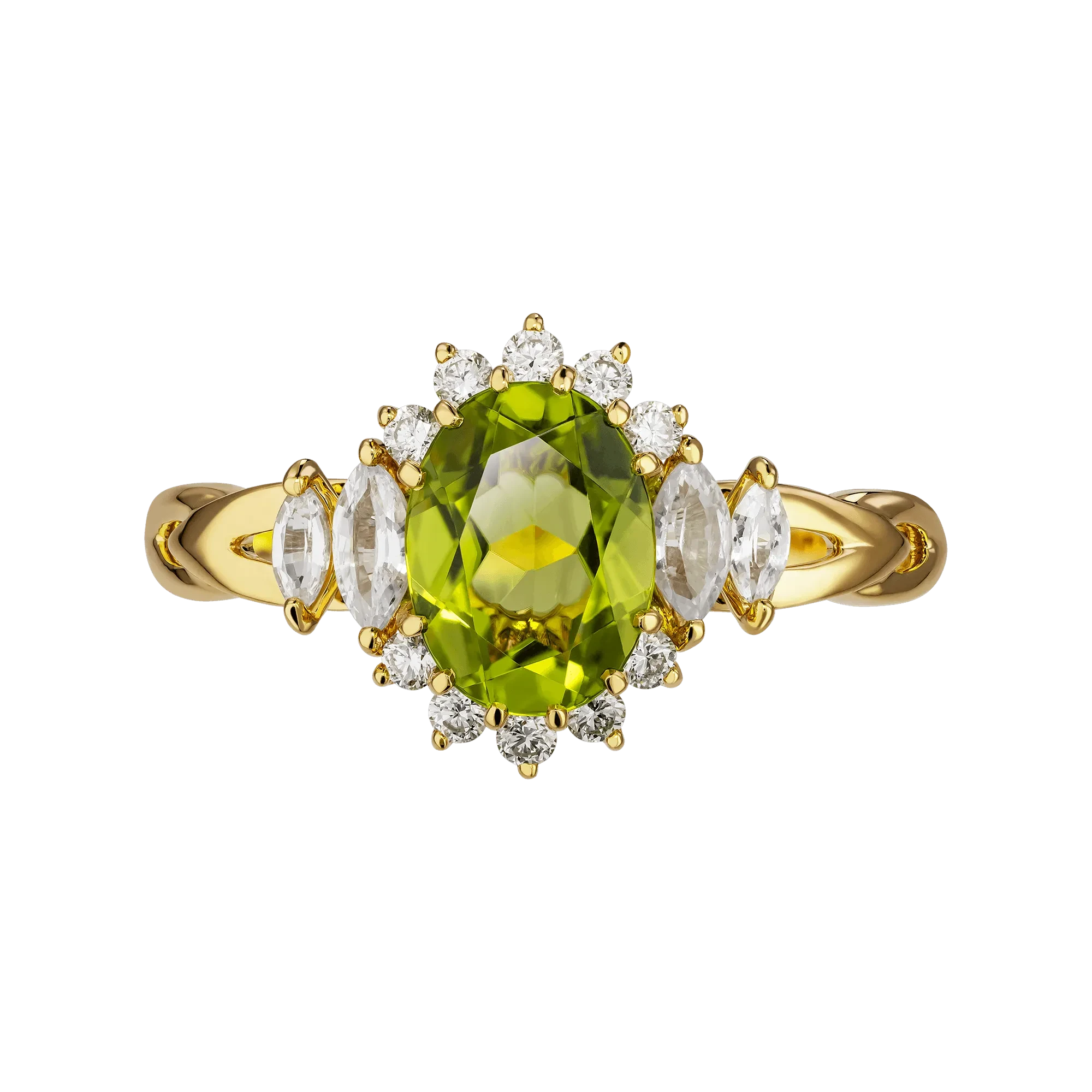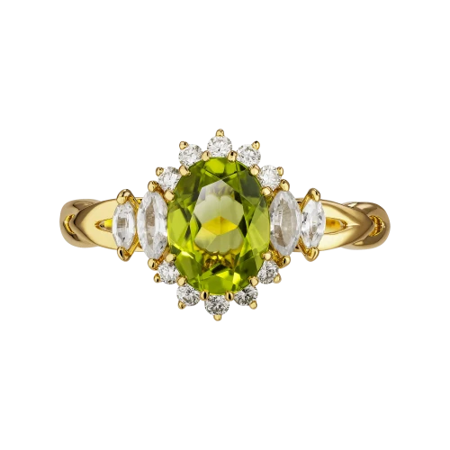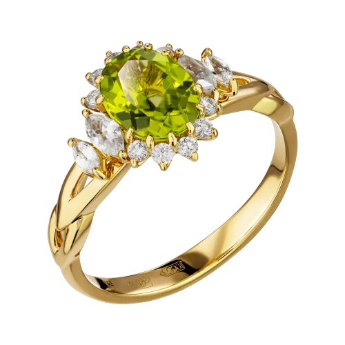 Яркий цвет центрального хризолита, впитывающего дыхание весны, скрывает в себе все мечты и надежды, становясь символом перемен, о которых так мечтает влюбленное сердце. Это кольцо как будто заключает в себе всю прелесть весенних дней, наполняя жизнь радостью и светом, словно весна будет в душе всегда.