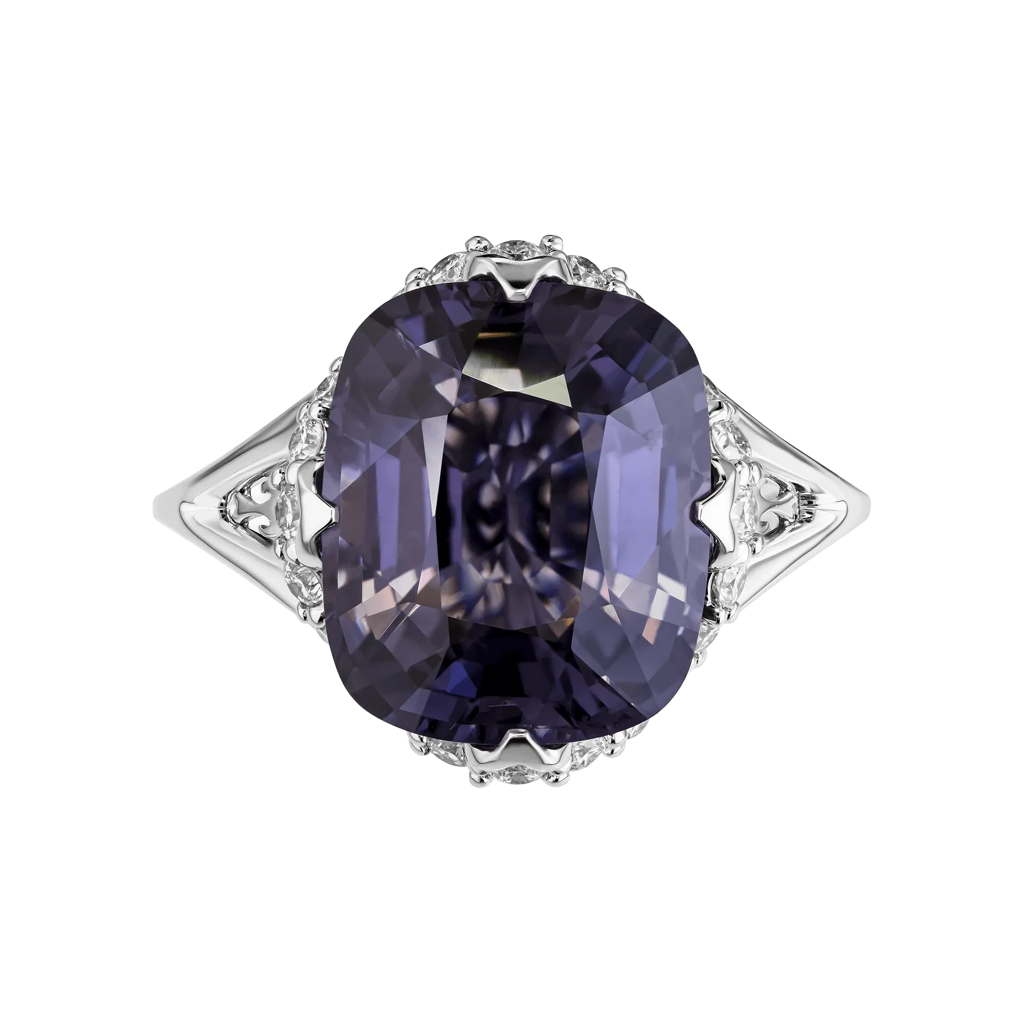 В центре композиции сияет благородная шпинель весом 7,05 карата – природный камень, чья окраска напоминает небо перед дождём. Под разными углами он раскрывает то холодный отблеск лилово-серых облаков, то мягкое свечение вечернего неба. В его глубине чувствуется тишина, наполненная дыханием грядущего шторма.