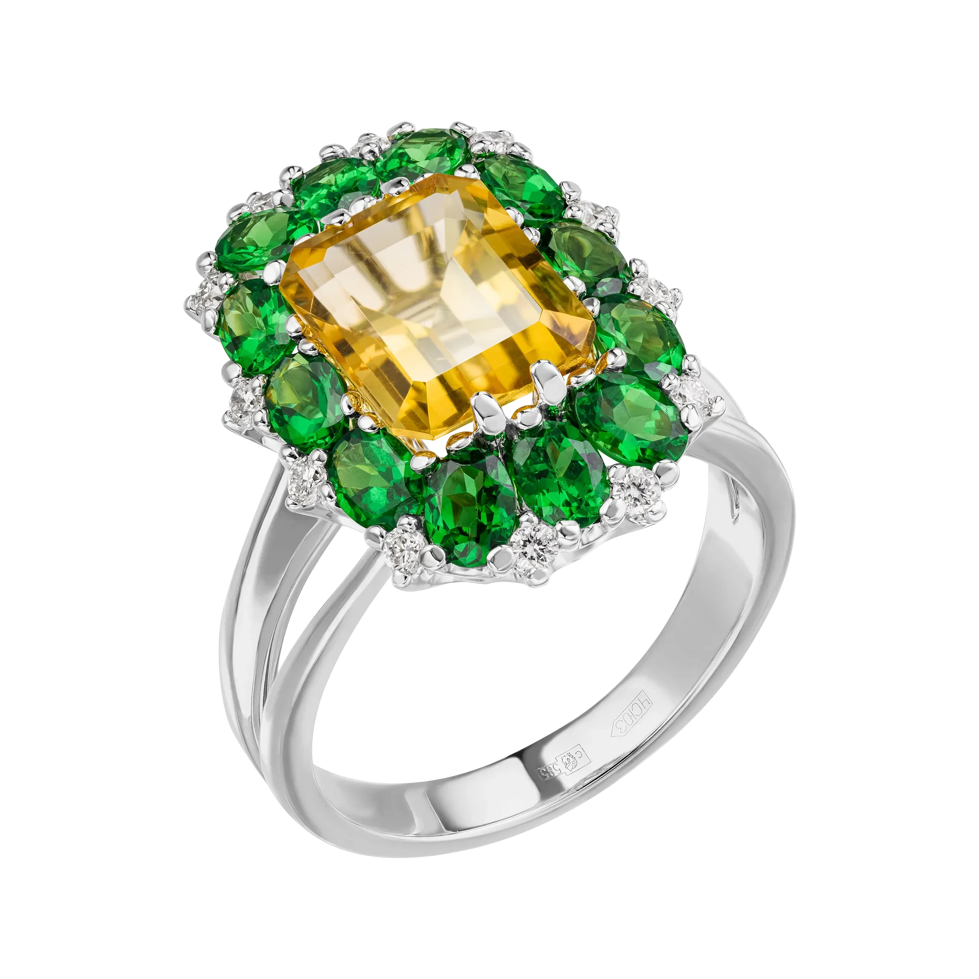 Солнечное настроение головокружительному кольцу придает главный акцент – лучезарный цитрин, чья чистота идеально подчеркнута виртуозной огранкой. Добытый в Бразилии самоцвет весом 2,69 карата буквально выбрасывает из своих глубин потоки позитивной энергии, в которых «расцветают» окружающие южноамериканский минерал тсавориты насыщенного зеленого цвета, чередующиеся со сверкающими прозрачными бриллиантами.