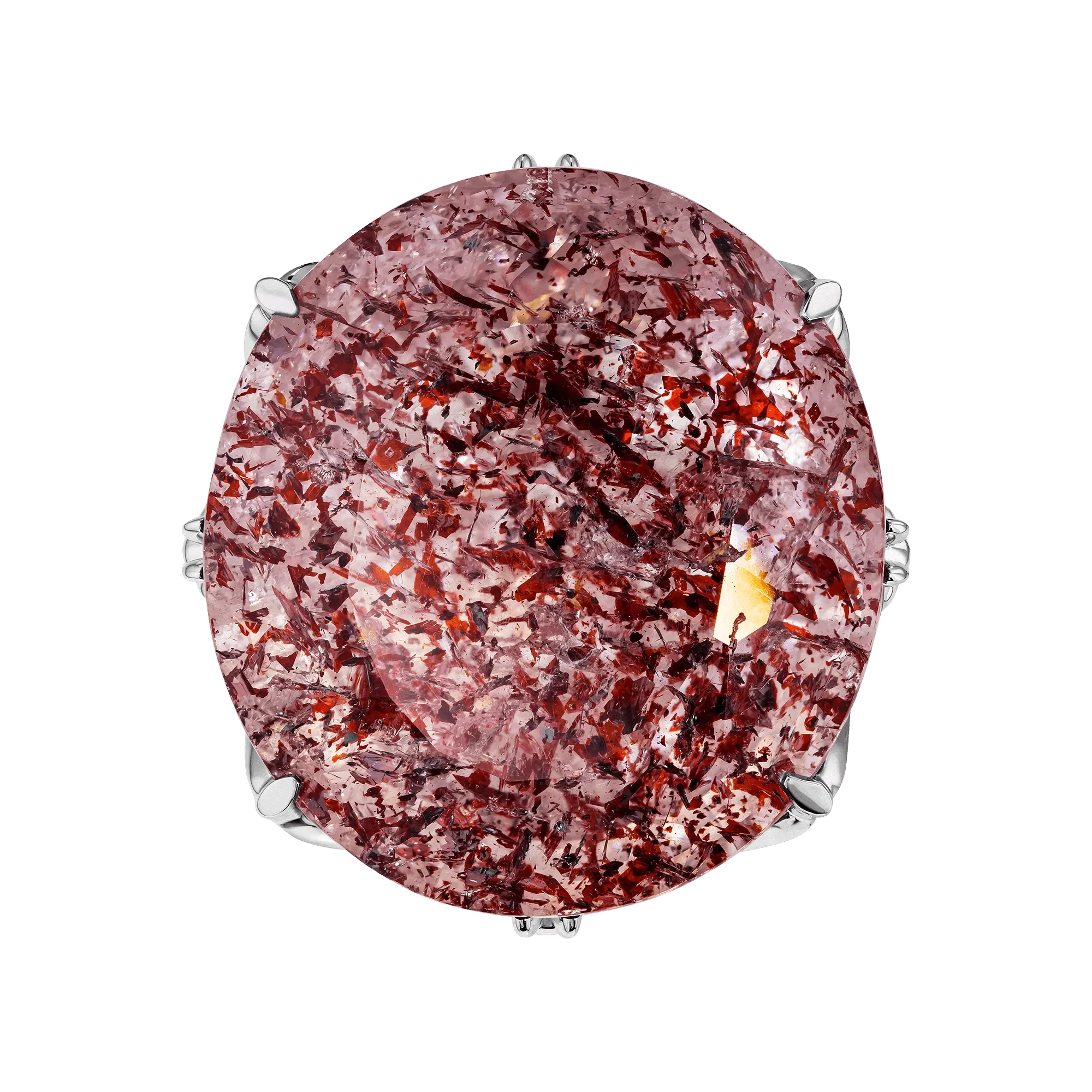 В центре композиции сияет редчайший клубничный кварц весом 39,11 карата, добытый в Индии. Его внутренняя структура хранит следы закатного света: тончайшие включения мерцают, будто частицы солнца осели в кристалле. Природный камень кажется живым – дышит теплом, переливается мягкими розовыми тонами, пробуждая воспоминания о долгих летних вечерах, когда всё ещё возможно.
