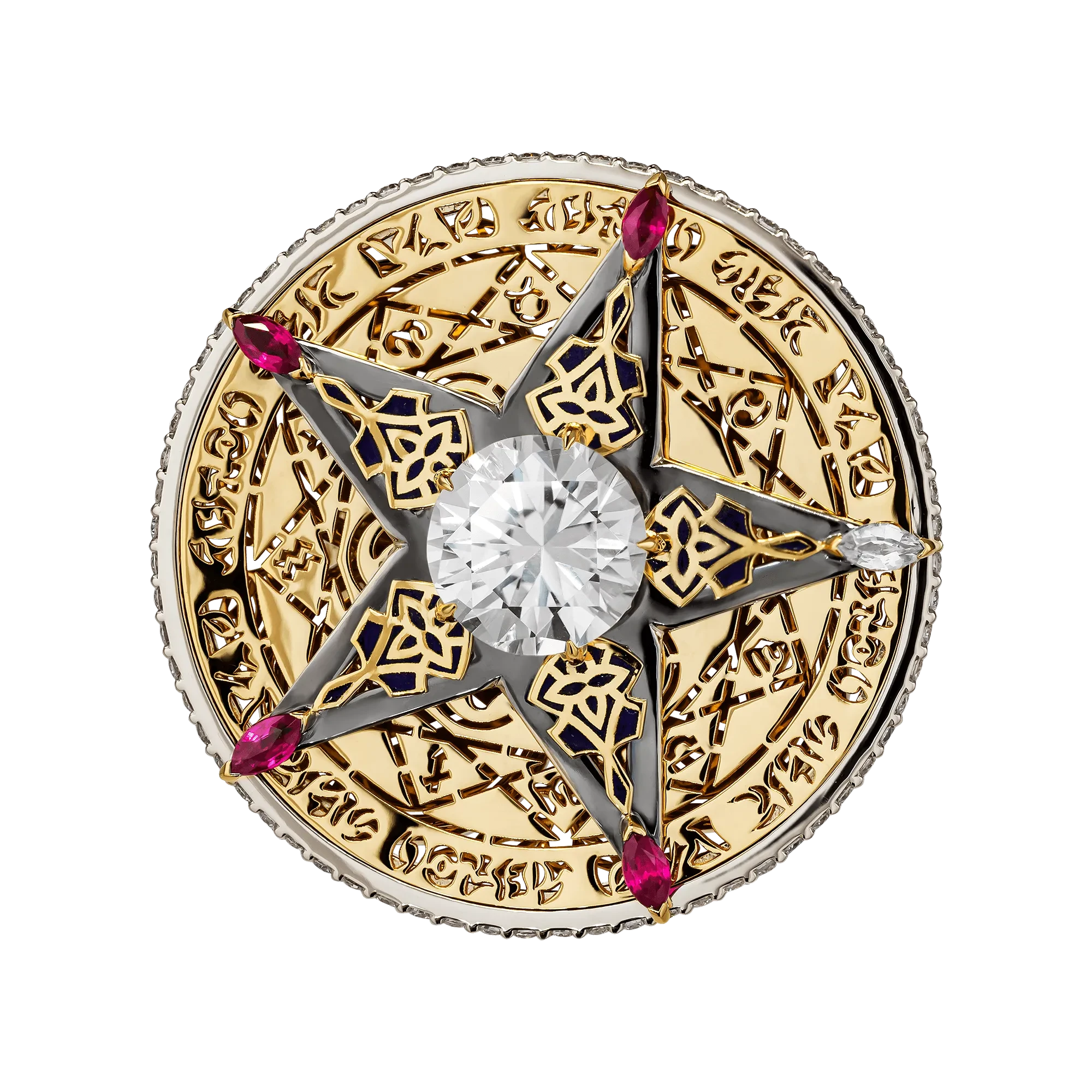 Вращающаяся звезда, закреплённая на оси кольца, задаёт динамику всей композиции и становится ключевым символом непрерывного движения. Акцентные рубины на её лучах вносят энергию и силу импульса, тогда как прозрачный сапфир отвечает за равновесие и устойчивость, формируя гармоничное взаимодействие эмоции и разума.