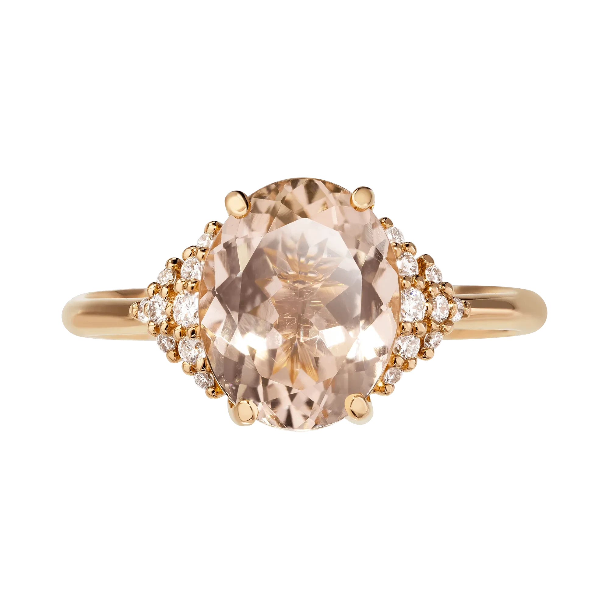 Красно-розовую комбинацию морганита весом более двух с половиной карат и глянцевой оправы оттеняют прозрачные бриллианты, подчеркивающие мягкую, ненавязчивую палитру кольца, способного добавить в образ владелицы сияющую женственность.