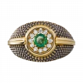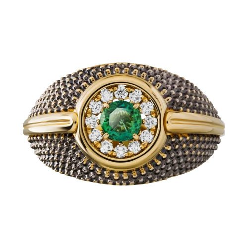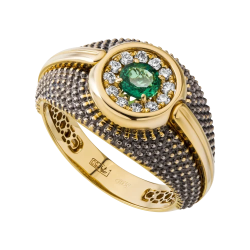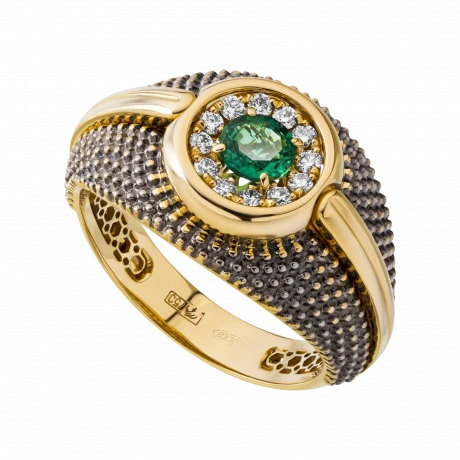 Впечатляющий таинственным сиянием изумруд весом 0,47 карата окружен бриллиантовой россыпью и заключен в стильную оправу желтого золота. Этот великолепный зеленый камень является символом мудрости и надежды, обновления и роста и служит предметом восхищения во многих культурах на протяжении более шести тысяч лет.