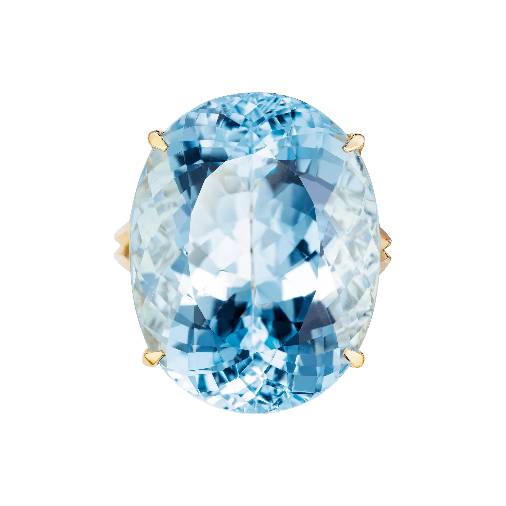 Жёлтое золото оправы становится тёплым сияющим солнцем, мягко обнимающим кристалл весом 27,40 карат, и усиливающим его внутренний свет. Контраст голубого и золотого рождает визуальный образ утреннего горизонта – того мгновения, когда первый луч встречает морскую гладь, превращая её в бескрайнее мерцание.