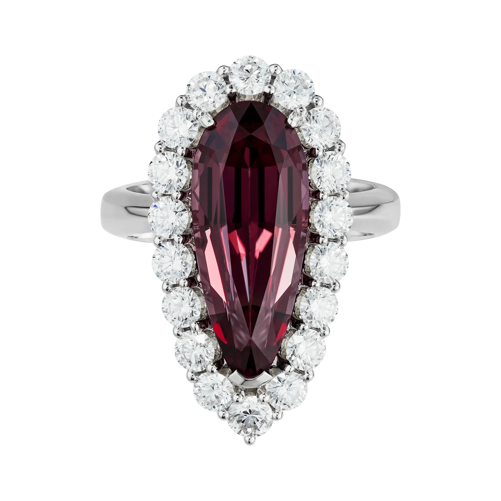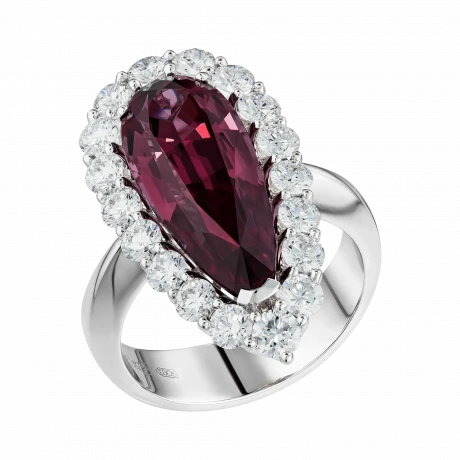 Огранка в форме капли подчёркивает внутренний характер самоцвета, словно фиксируя мгновение перехода между пламенем и тенью. Ореол из бриллиантов усиливает ощущение загадочности, создавая чистый световой контраст. Белое золото оправы становится нейтральным фоном, подчёркивая глубину оттенков и объём формы, и выстраивает гармоничный баланс между силой центрального камня и тонкой игрой сияющих граней.