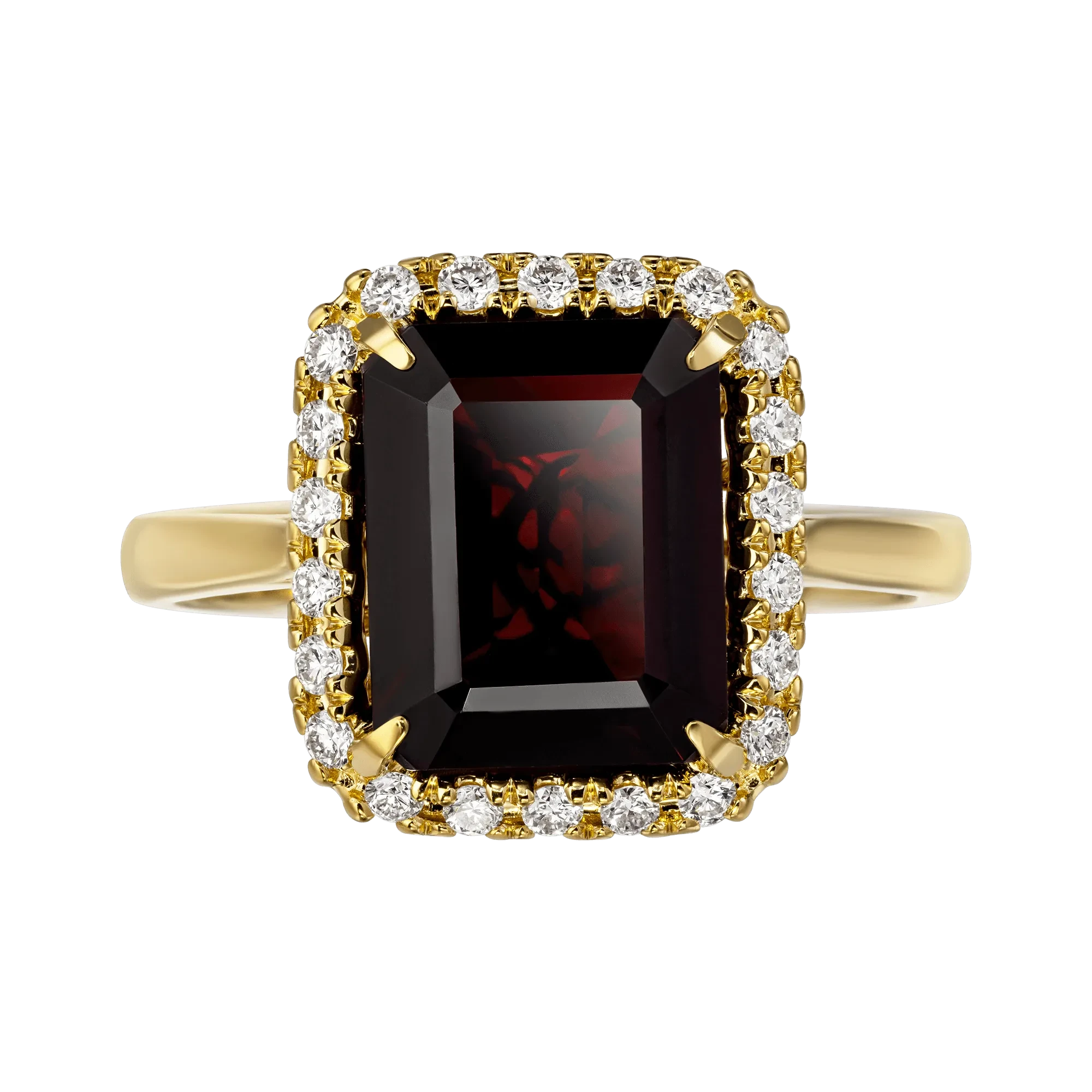 Элегантные золотые линии, чьим главным декором стали многочисленные сверкающие бриллианты, не просто удерживают в своих объятиях безупречный гранат весом 3,08 карата, а создают ему поистине неотразимый образ и благородный ореол. Благодаря искусной огранке, пламенный минерал – символ искренней страстной любви, от природы наделенный прекрасными свойствами, демонстрирует потрясающие нюансы красного цвета.