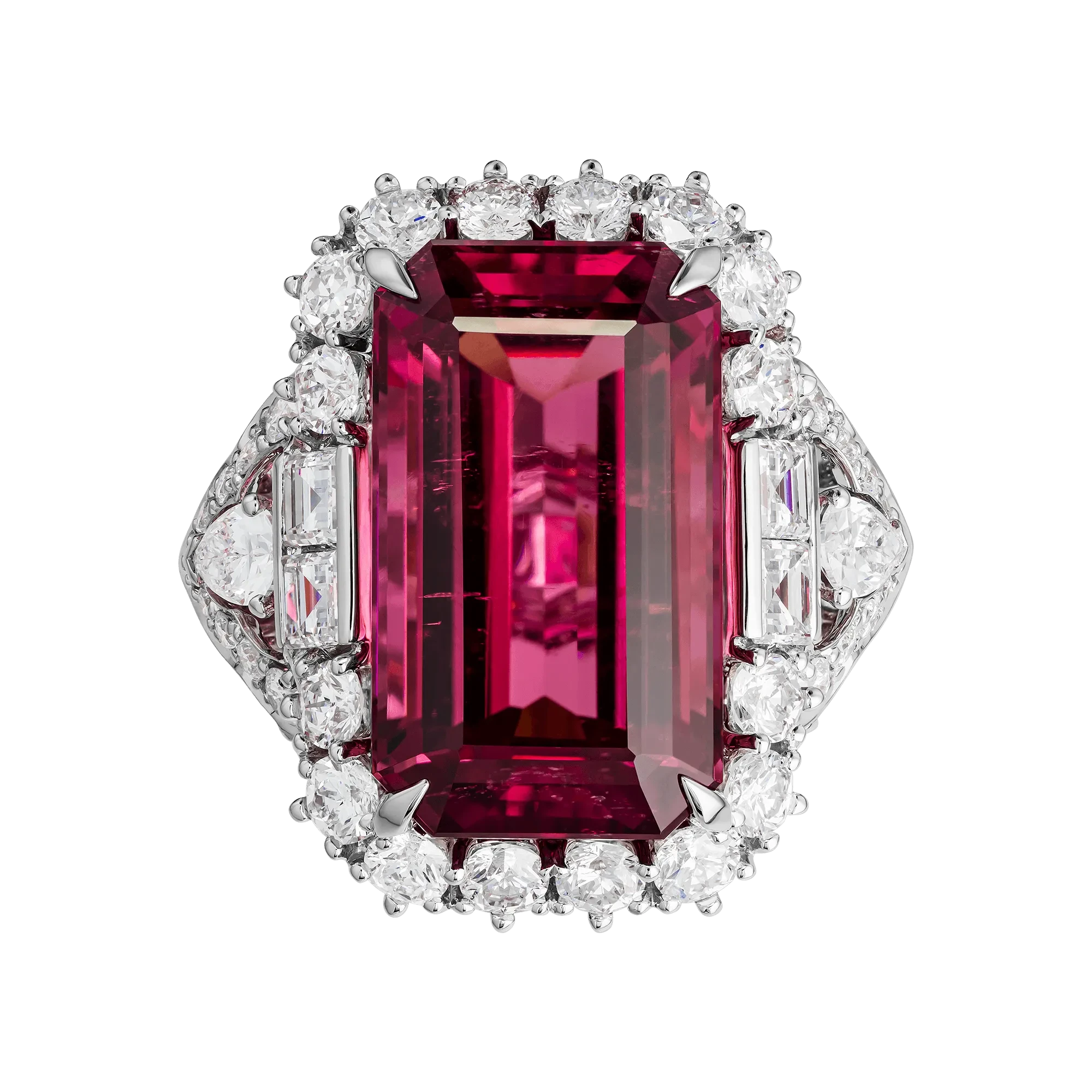Мозамбикский рубеллит демонстрирует густой малиново-пурпурный оттенок с благородной глубиной и внутренним свечением. Его цвет плотный и многослойный, словно бархатный лепесток, раскрытый в самом центре тщательно выстроенной композиции. Высокая прозрачность и точная огранка усиливают ощущение объёма, позволяя свету проникать вглубь и возвращаться насыщенным, живым блеском.