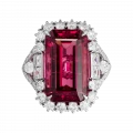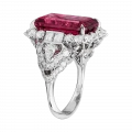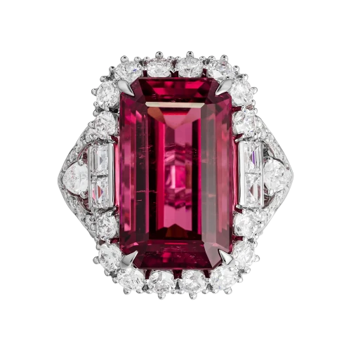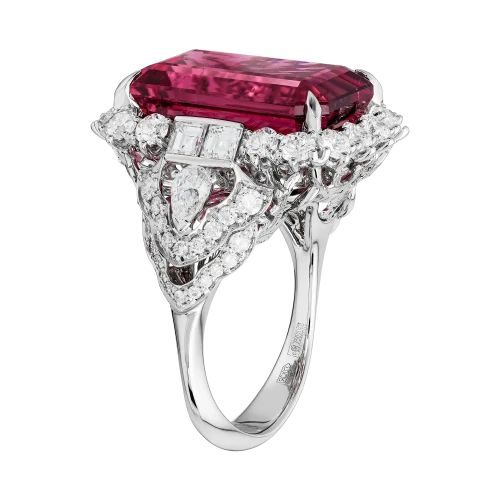 Окружение из бриллиантов и изящные линии оправы из белого золота выполняют роль архитектурного обрамления — они подчёркивают масштаб центрального камня, не отвлекая от него внимания. В результате кольцо воспринимается как торжественный акцент, где пышность выражена не в избыточности деталей, а в силе и красоте самого рубеллита.