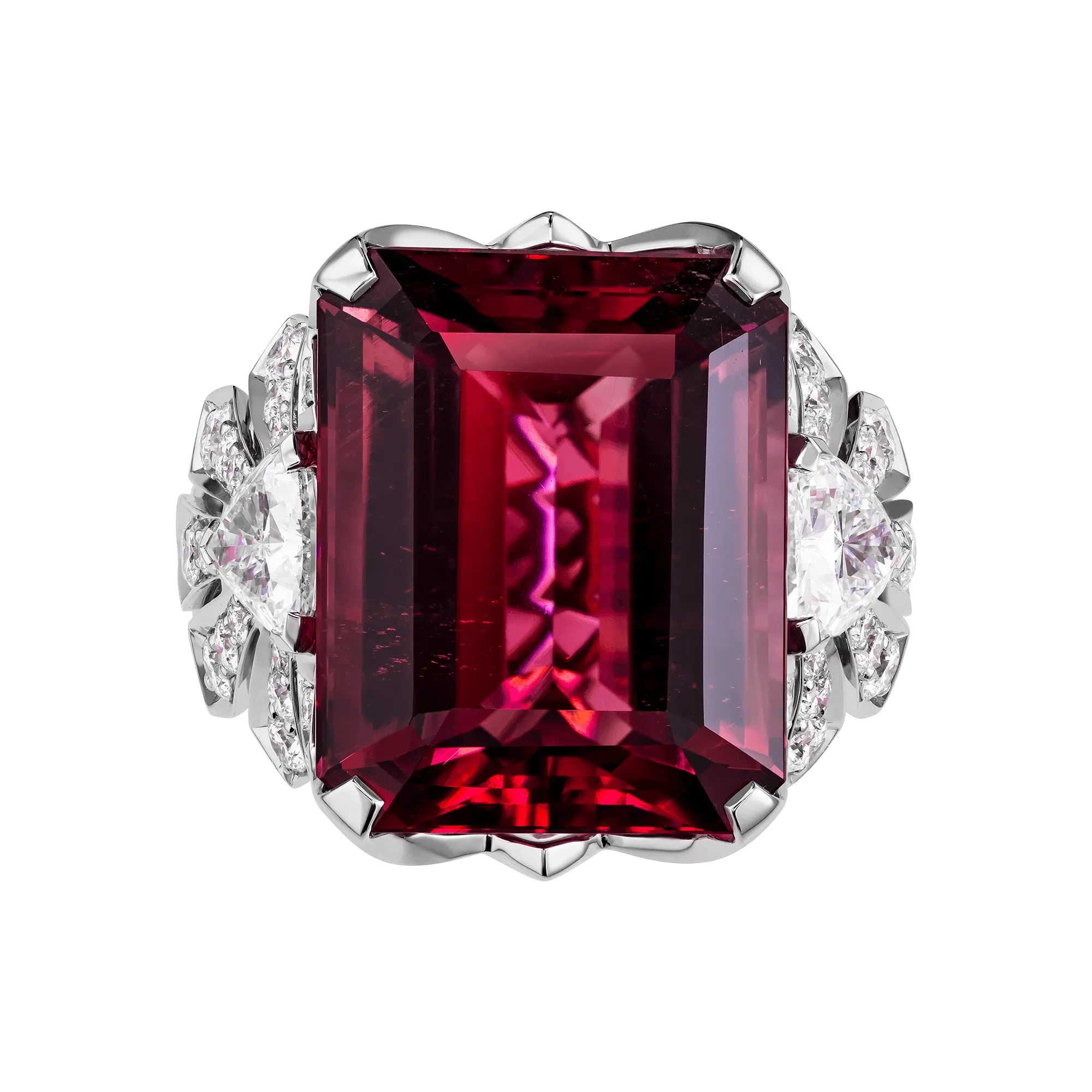 В центре композиции – розовый турмалин весом 15,73 карата, добытый в Африке. Драгоценный камень является истинной редкостью: насыщенный малиновый оттенок, исключительная прозрачность и внушительный размер делают его уникальным явлением в ювелирном мире. Прямоугольная огранка подчёркивает глубину кристалла, усиливая игру света и превращая его в яркий, почти императорский акцент.