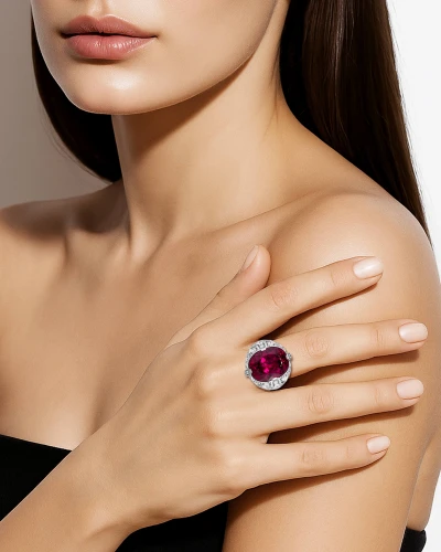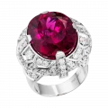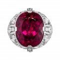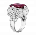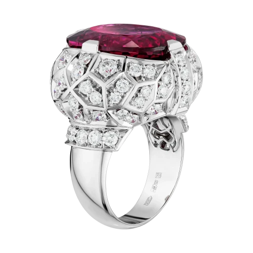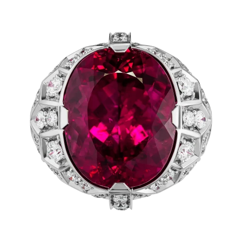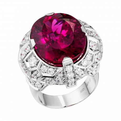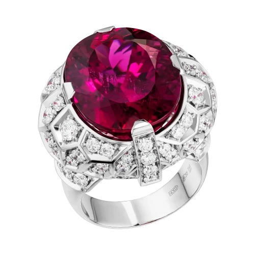 Рубеллит возвышается над оправой, выполненной из белого золота в форме массивного перстня, подчёркивая его статус доминирующего элемента композиции. Россыпь крупных бриллиантов формирует вокруг центрального камня сияющий ореол, усиливая эффект драгоценного света и создавая ощущение торжественности. Белое золото выступает благородным фоном, на котором цвет рубеллита раскрывается с максимальной выразительностью. В результате украшение становится не просто ювелирным объектом, а символом пути, редкости и истинной ценности — той, что не теряет силы сквозь века.