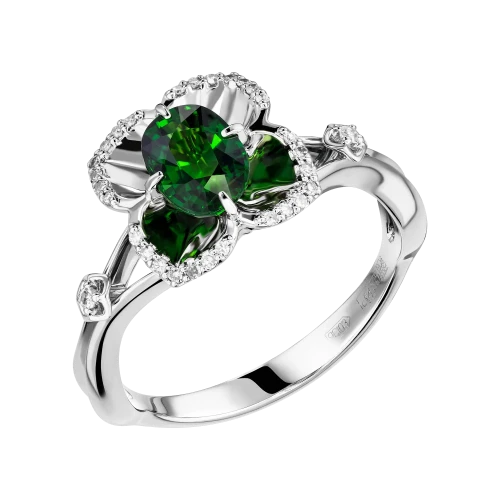 Белое золото оправы растворяется в блеске бриллиантов, образующих тонкое обрамление вокруг центрального кристалла. Их мерцающая игра подчёркивает глубину зелёного сияния тсаворита, а контраст холодного металла и тёплого внутреннего света минерала рождает ощущение целостности и завершённости.