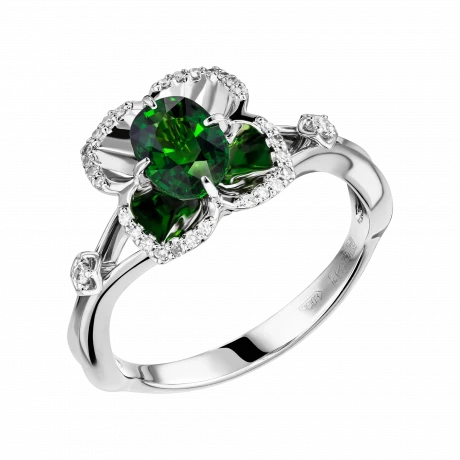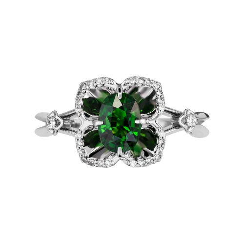 В его центре сияет редкий тсаворит весом 1,07 карата – минерал с живым зелёным оттенком, в котором отражается свежесть весенней листвы и сила самой земли. Его насыщенность и чистота создают впечатление кристаллизованного света, заключившего в себе дыхание природы.
