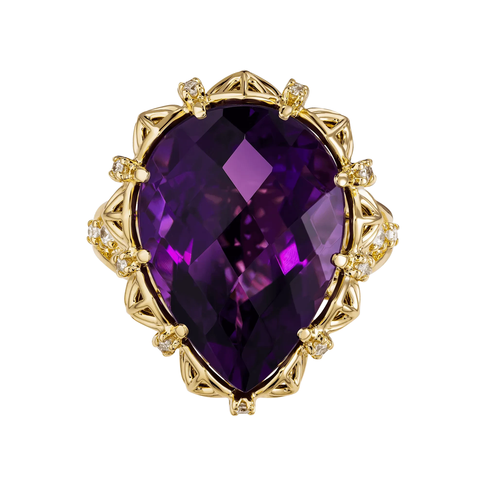 В центре композиции сияет бразильский аметист весом 10,44 карата. Его насыщенный фиолетовый цвет наполнен бархатной глубиной, а тонкая игра граней рождает всполохи пурпурных и лиловых оттенков при каждом движении. Ажурная оправа из жёлтого золота окружает природный камень тонким кружевом, словно создавая для него изящный трон. Искры бриллиантов добавляют контрастный блеск, подчеркивая природную силу и выразительность самоцвета.