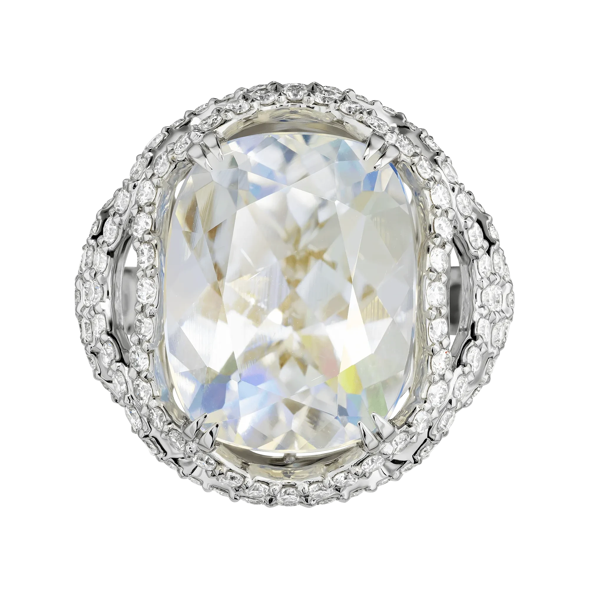 Ажурная оправа из белого золота подчёркивает центральный камень, не утяжеляя композицию. Более ста бриллиантов, инкрустированных по поверхности оправы, формируют световой ореол, усиливающий сияние лунного камня и создающий ощущение воздушности и пространственной лёгкости.