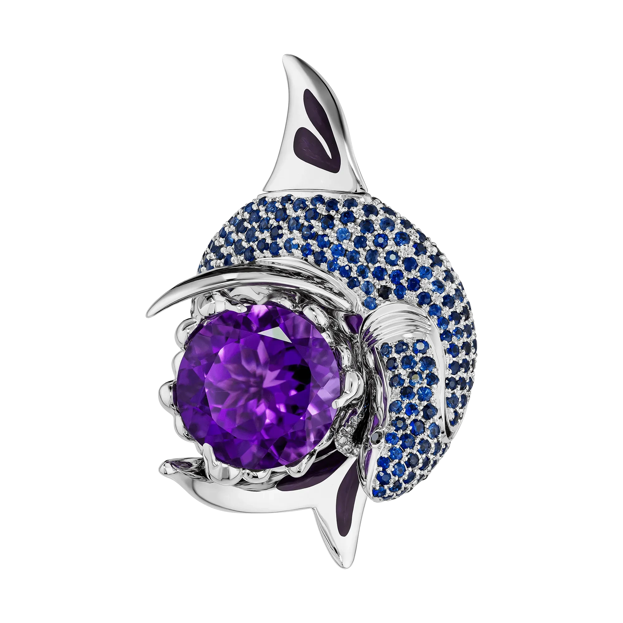Тело акулы покрыто синими сапфирами, выстроенными в ритмичную структуру, напоминающую переливы океанской толщи. Чёрные бриллианты в глазах придают образу сосредоточенность и характер, а плавники, покрытые горячей эмалью, подчёркивают пластичность и динамику формы.