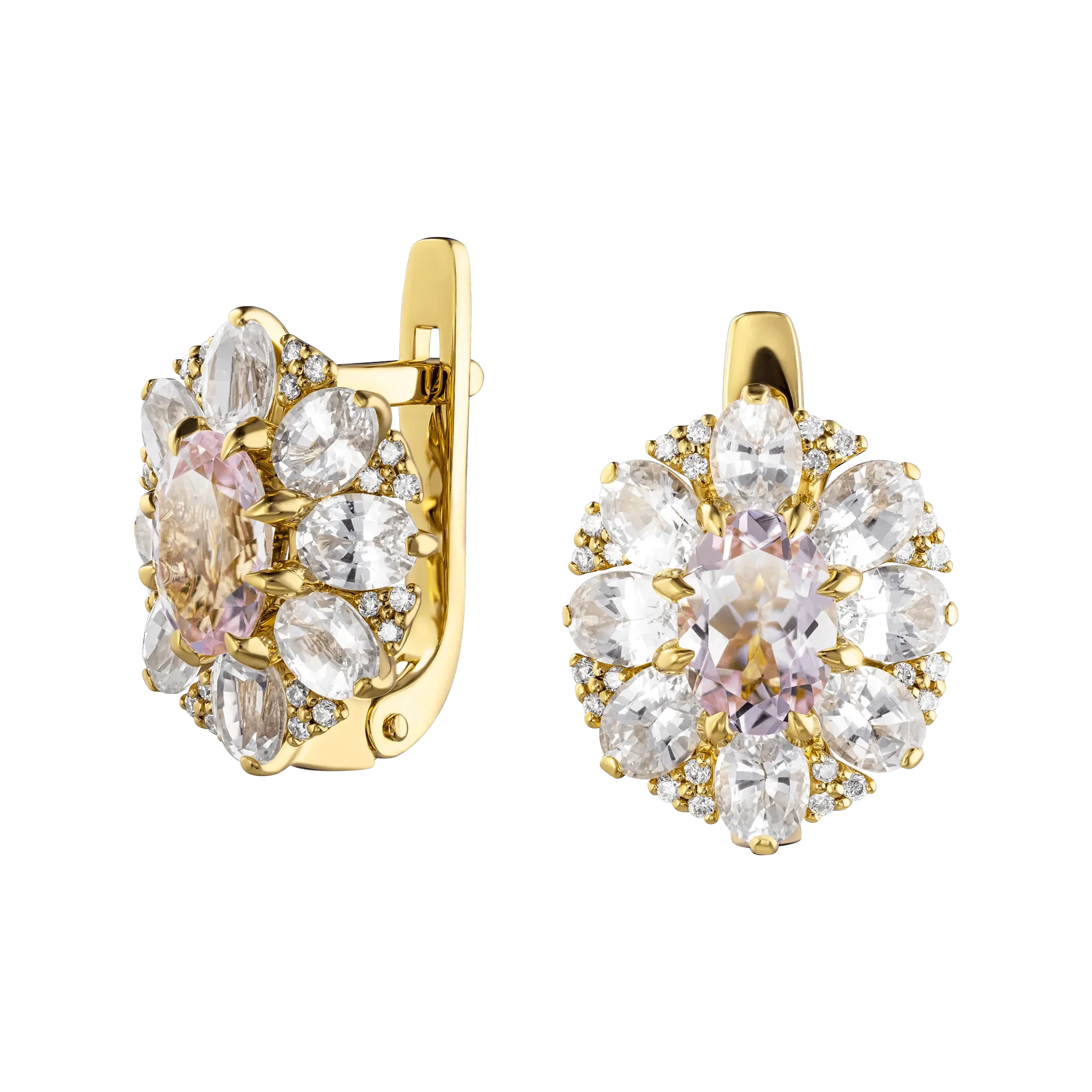 Красоту закрепленного в центре сдержанной оправы из желтого золота дуэта бразильских самоцветов мастера обыграли, также, с помощью обрамляющих бриллиантов и сапфиров, раскрывшихся подобно утренним лепесткам. Утонченный дизайн серег «Моллис» позволит обладательнице не расставаться с украшением ни при каких обстоятельствах, радуя себя их изысканностью на дневных деловых и вечерних приемах.