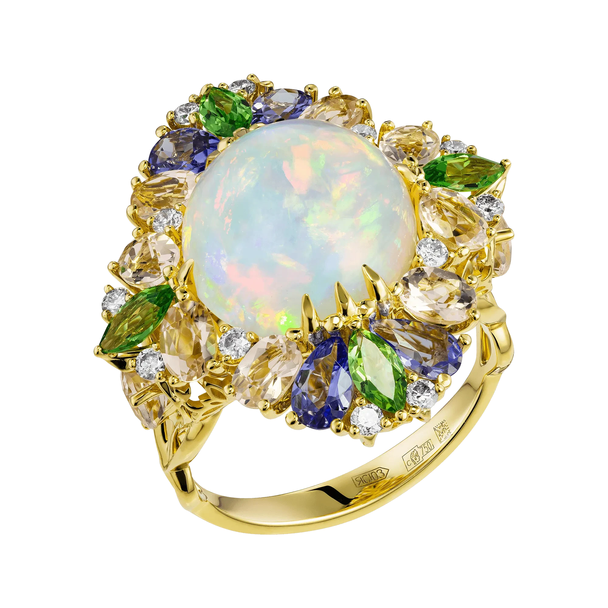 Жёлтое золото объединяет композицию тёплым сиянием, словно солнечный ореол, удерживающий это многоцветие в балансе. Плавные линии оправы подчёркивают природную пластику самоцветов, позволяя свету свободно скользить по их поверхности и усиливать игру оттенков.