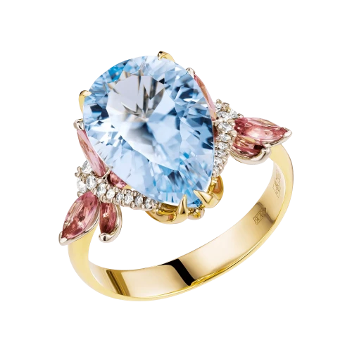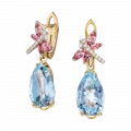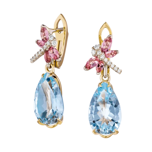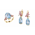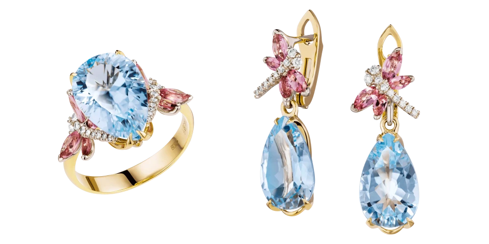 Гарнитур «Танец стрекоз» хранит атмосферу летнего вечера, когда небо окрашивается мягким сиянием заката, а воздух наполняется покоем и тайной мечты. Голубые топазы общим весом 14,95 карата словно вобрали небесный свет, который постепенно растворяется в сумерках, оставляя на гранях кристаллов прохладное прозрачное сияние.