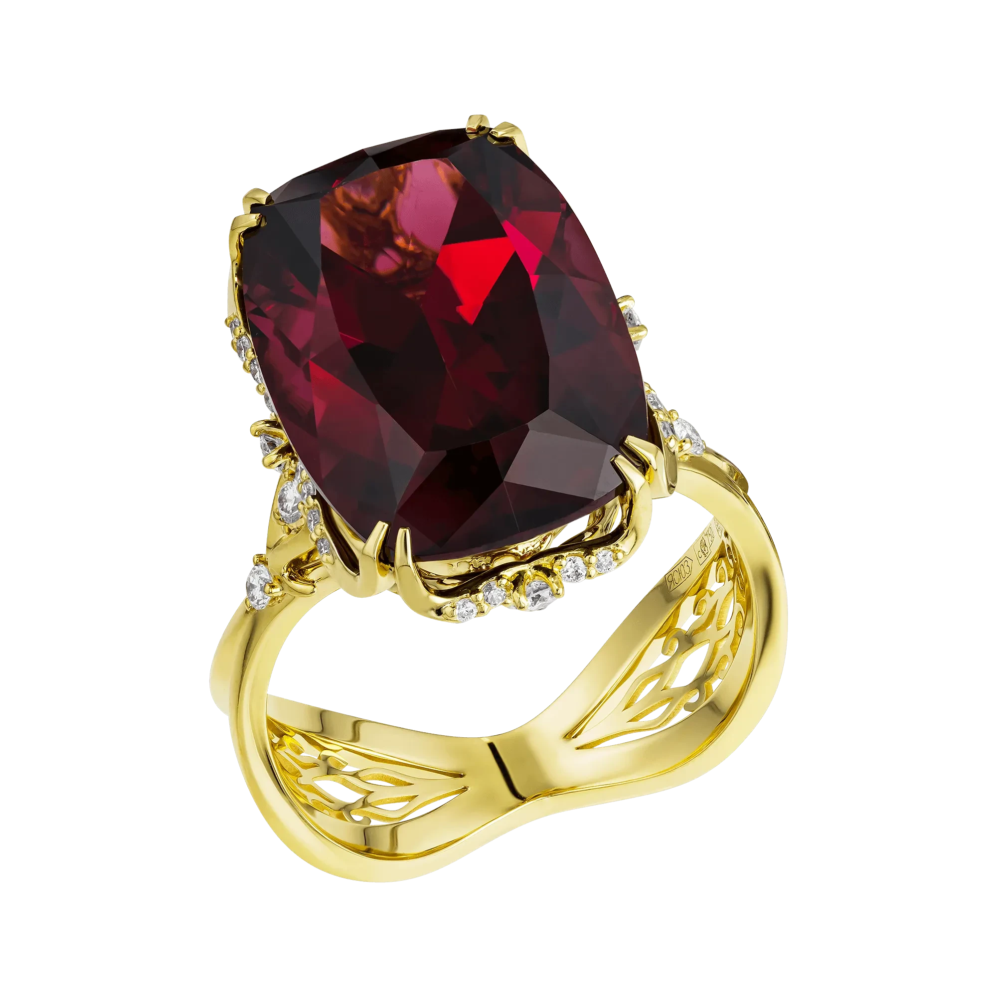 Центральную роль в композиции играют танзанийские родолиты — разновидность граната, ценимая специалистами за насыщенный винно-малиновый оттенок с тёплыми пурпурными и огненными нюансами. Камни из Восточной Африки отличаются высокой прозрачностью и живой световой отдачей: при изменении освещения цвет раскрывается многослойно, переходя от глубокого красного к оттенкам закатного жара. Именно эта сложная хроматическая природа сделала родолит востребованным среди коллекционеров и ювелиров, работающих с выразительными цветными камнями.