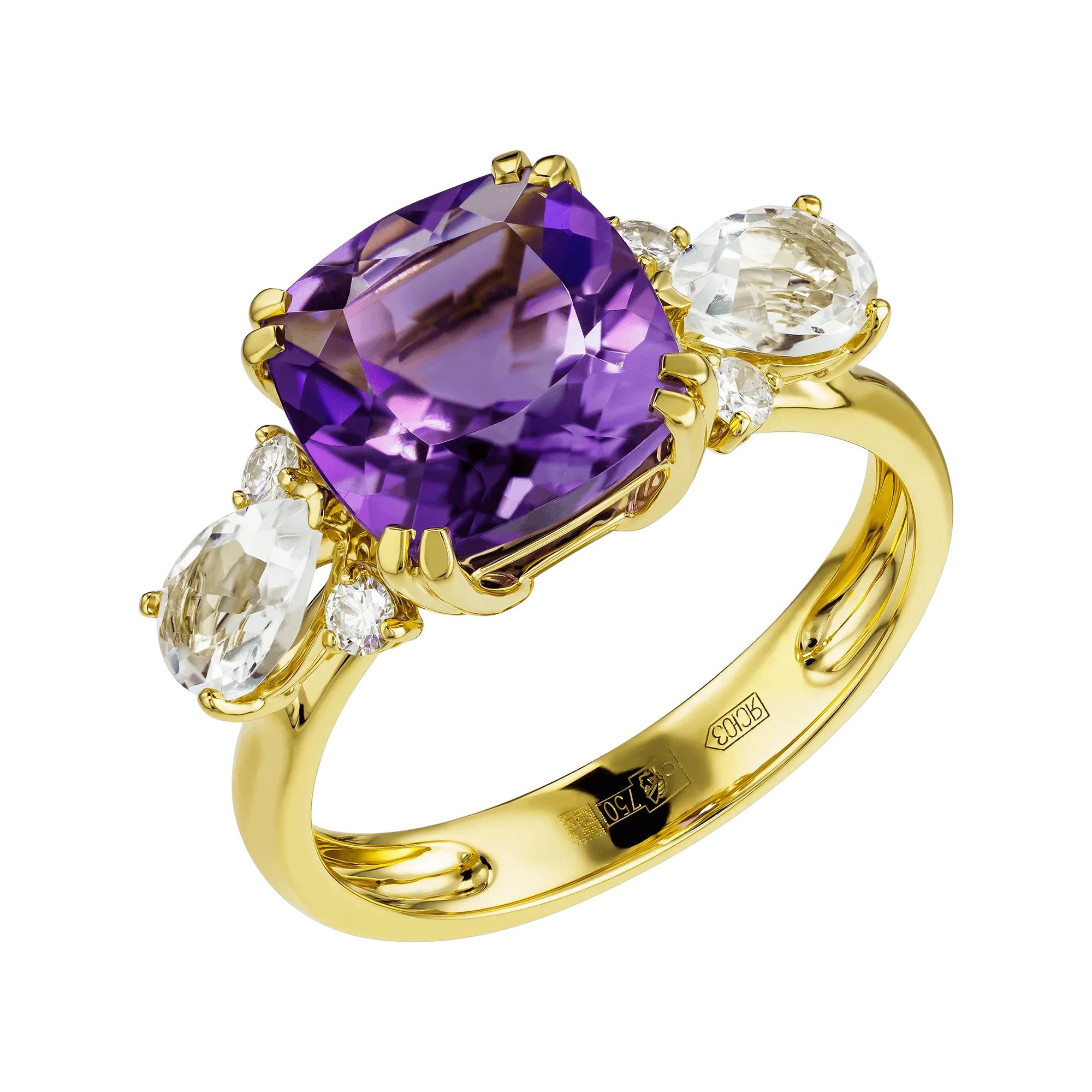 В центре композиции — аметисты из Бразилии с насыщенным фиолетовым тоном, в котором угадывается глубина тропической ночи. Их цвет раскрывается многослойно — от бархатных тёмных переливов до мягких световых вспышек, возникающих при движении. Капли белых сапфиров и россыпь бриллиантов добавляют холодные световые акценты, словно отражения далёких огней, рассыпанных по вечернему городу.