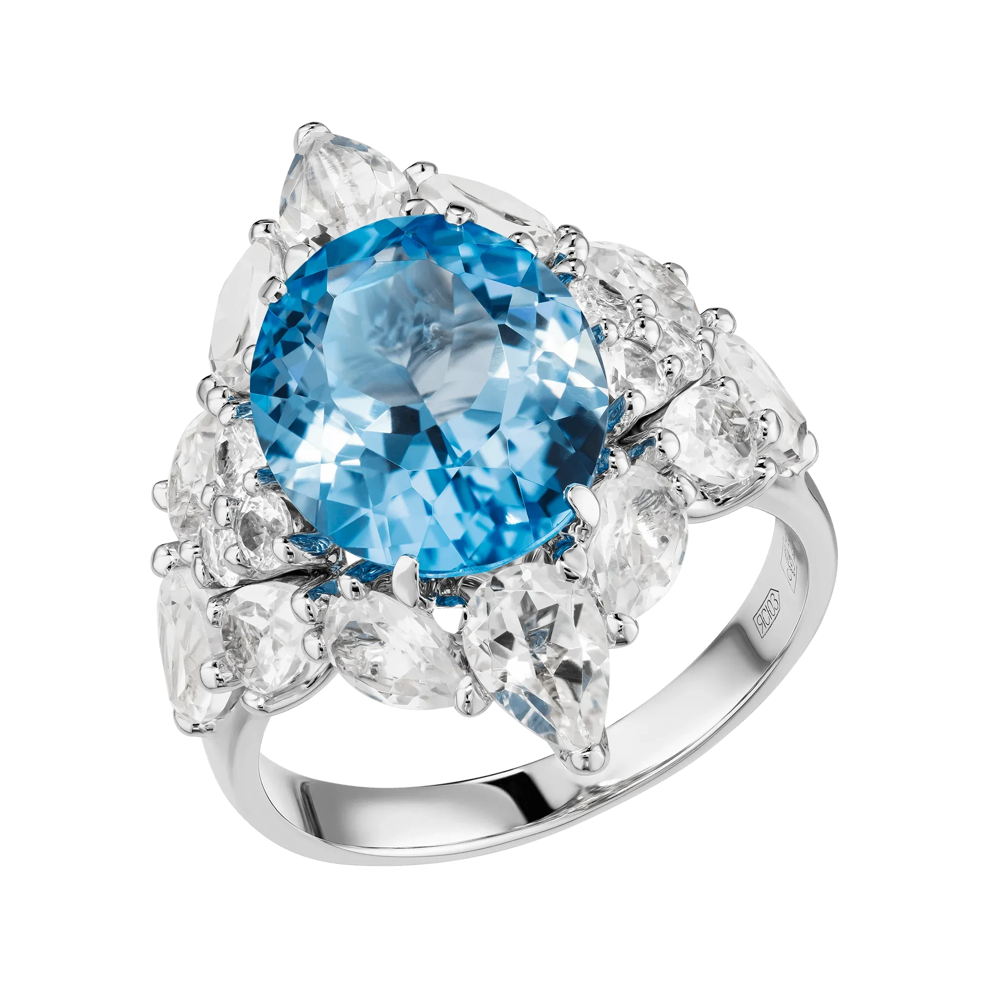 Вокруг крупных топазов рассыпаны белые сапфиры и топазы разных огранок, усиливающие игру бликов и создающие впечатление мерцающего инея. Белое золото оправы придаёт композиции холодное благородство и завершённую чистоту формы, словно кристалл, выточенный самой природой.