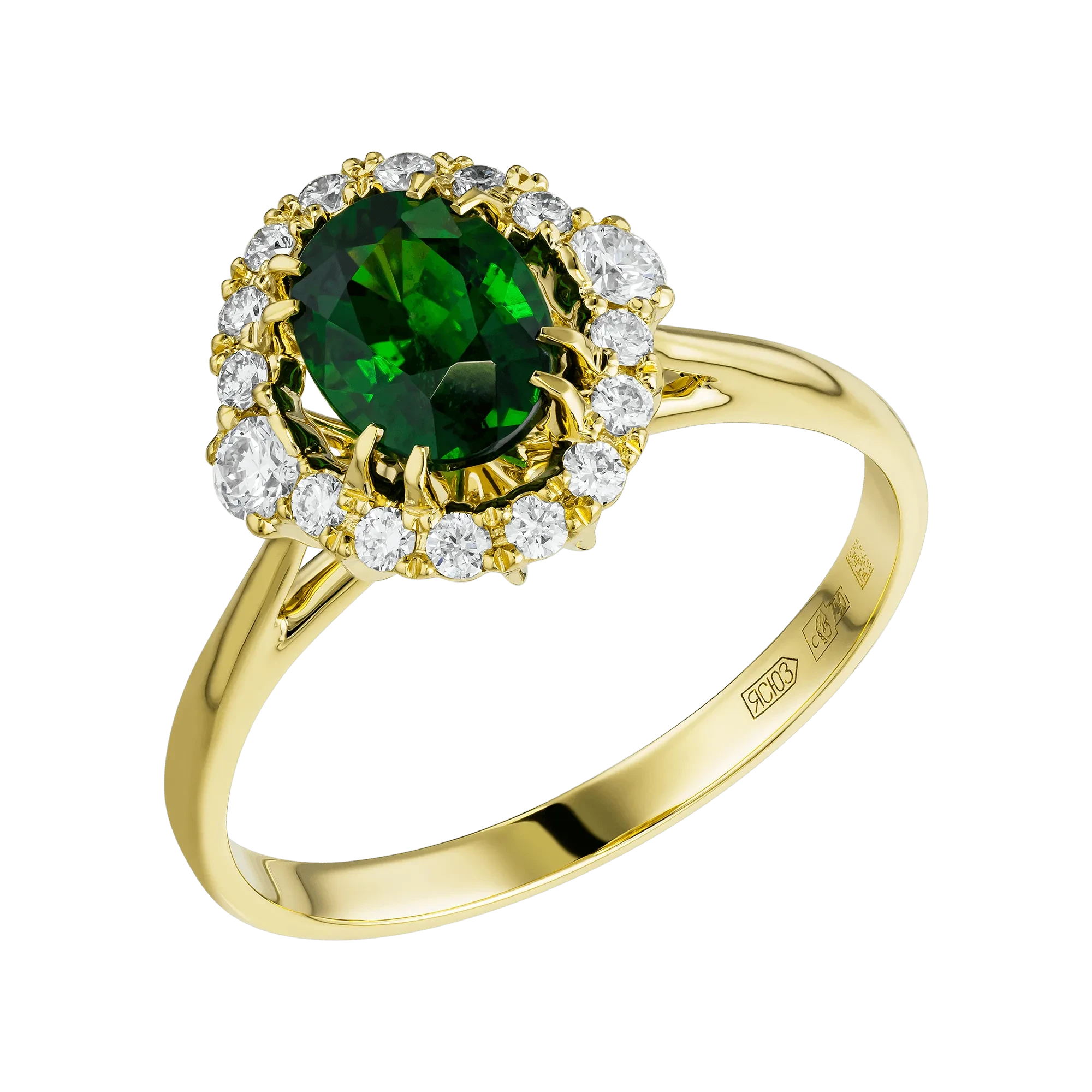 В центре композиции — тсавориты из Кении, драгоценные камни, высоко ценимые геммологами за исключительную яркость и насыщенность цвета, не требующую дополнительной обработки. Их зелёный тон раскрывается многослойно: от свежего, почти прозрачного свечения до густого хромового оттенка с плотной глубиной. Такая оптика формируется лишь в уникальных геологических условиях Восточной Африки и делает тсаворит одним из самых выразительных зелёных самоцветов современности.