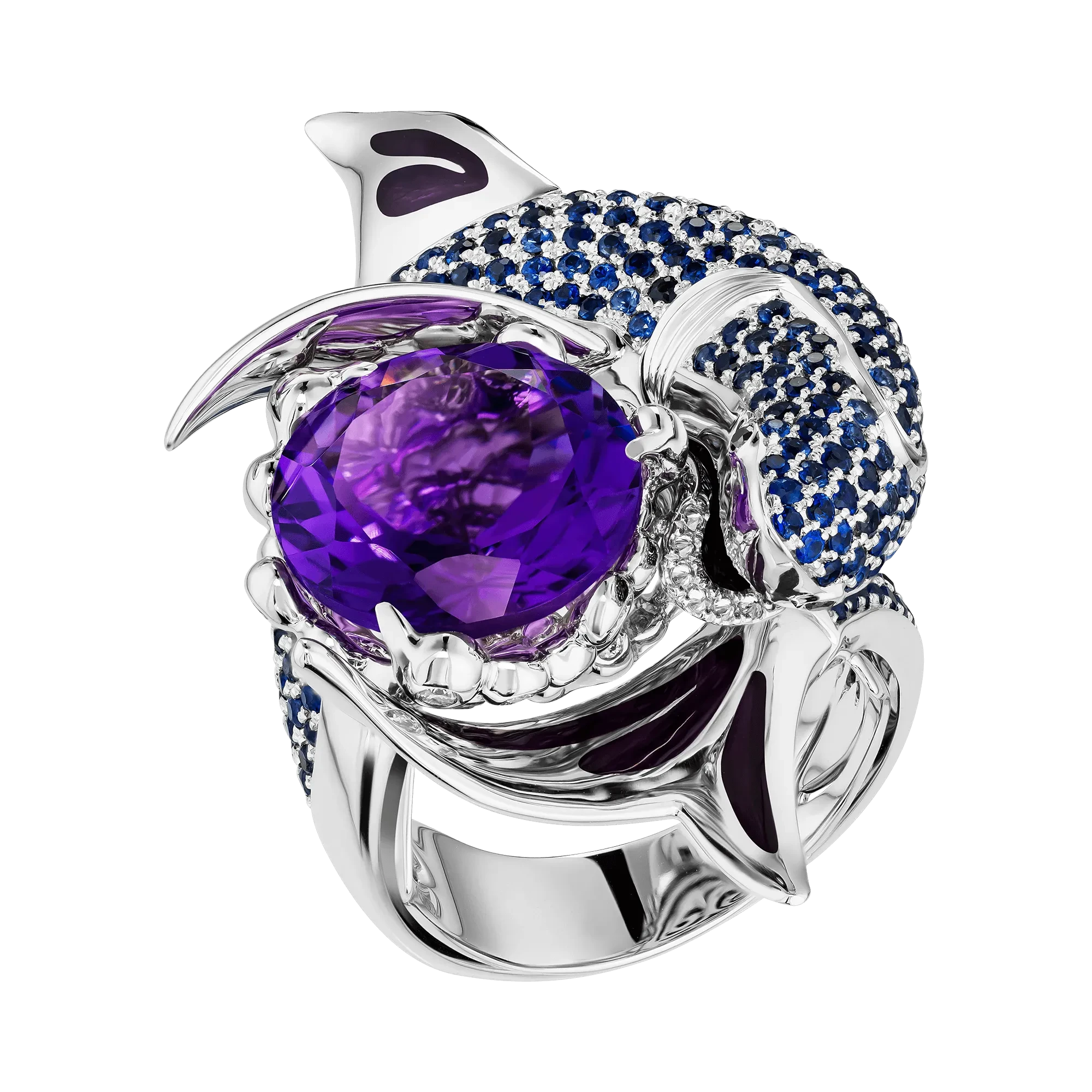 Центральный бразильский аметист с насыщенным фиолетовым тоном формирует сердцевину композиции, становясь источником внутреннего напряжения и притягательной мистики. Его цвет вступает в диалог с холодным сиянием белого золота, усиливая ощущение глубины и скрытого движения. Бриллианты, расположенные в основании, направляют свет внутрь камня, создавая эффект живого, пульсирующего свечения.