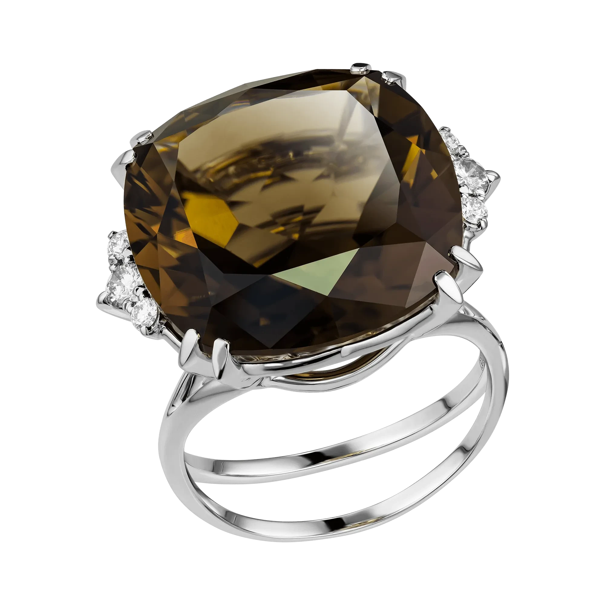 В центре композиции – дымчатые кварцы общим весом 38,72 карата, добытые в бразильском регионе Минас-Жерайс, где природа создаёт минералы с редким золотистым отливом и удивительной глубиной цвета. Их тёплая палитра напоминает о последних лучах солнца, которые задерживаются на горизонте, растворяясь в прозрачном воздухе.