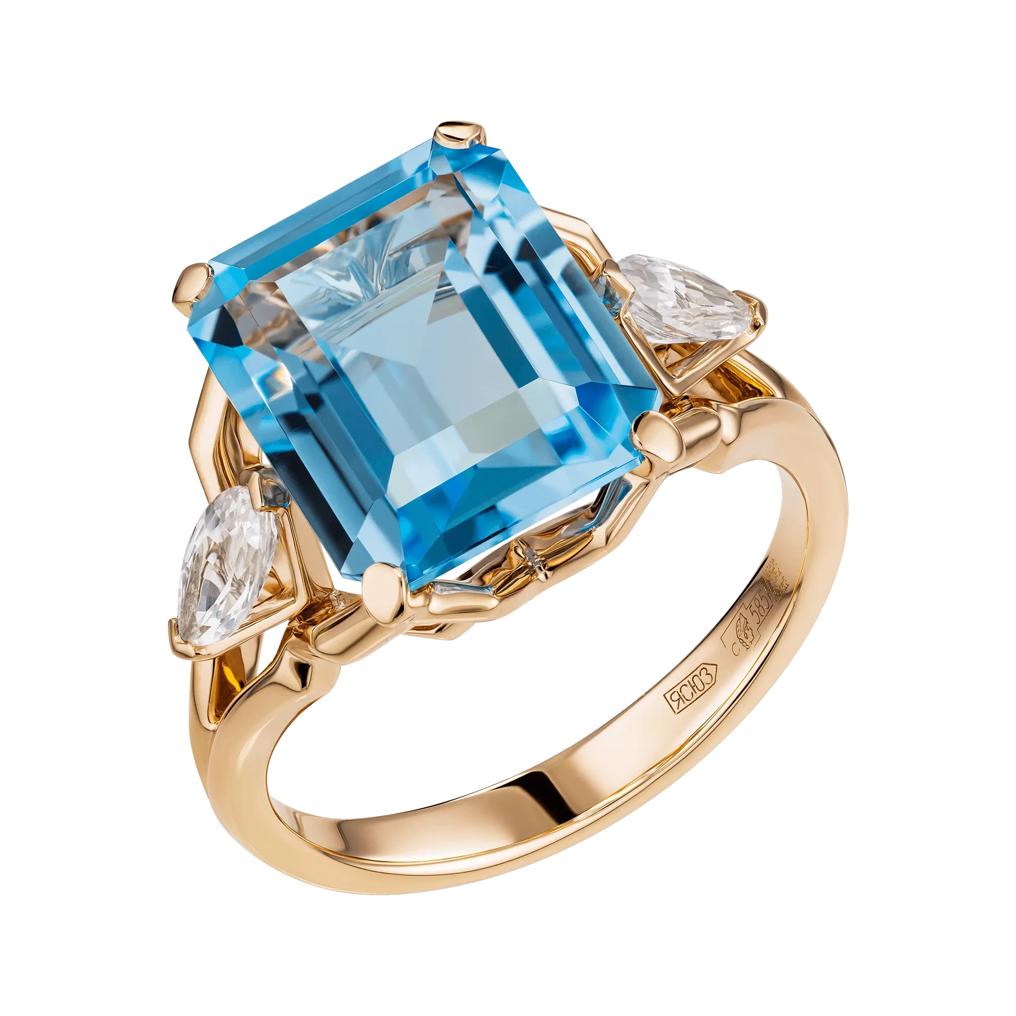 Ярко-голубые бразильские топазы общим весом 11,77 карата, заключённые в оправу из красного золота с акцентами белых сапфиров, словно играют со светом, отражая оттенки неба и воды. Их сияние – живое и текучее, как поверхность океана на рассвете, когда солнце лишь касается горизонта.